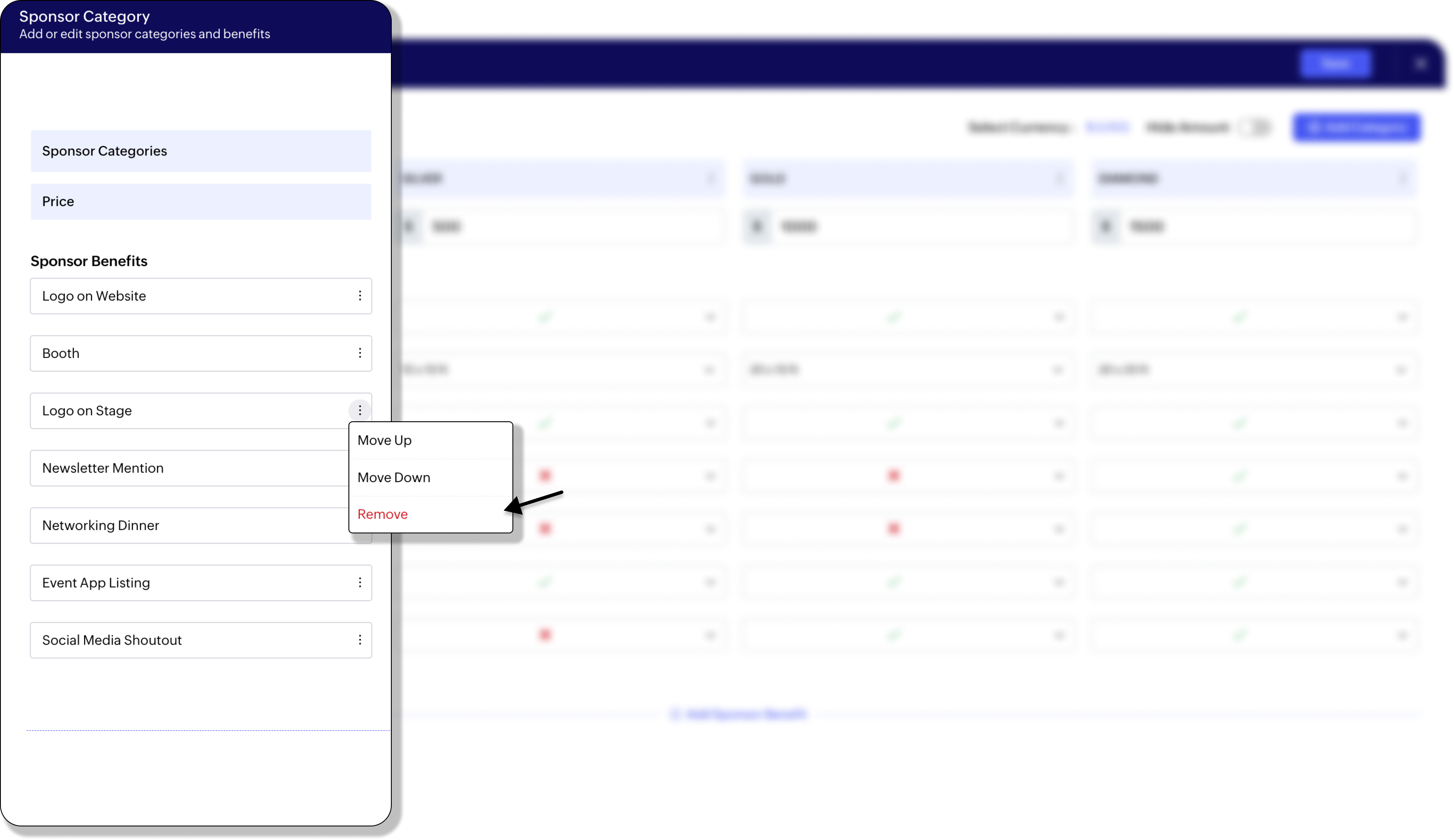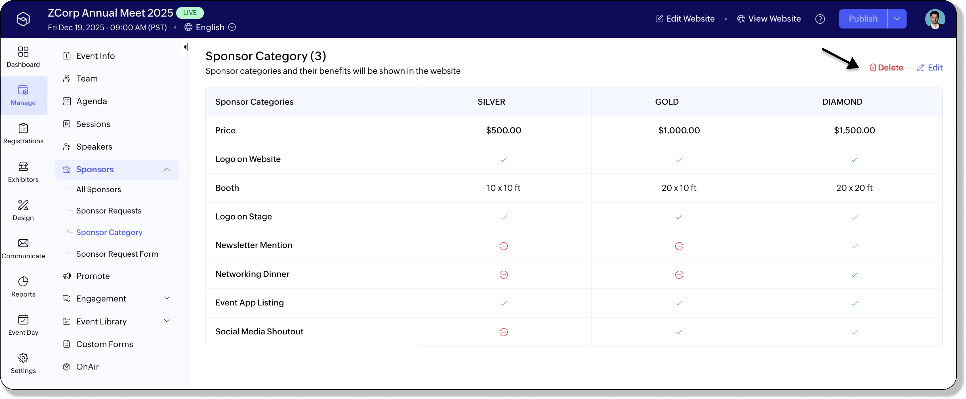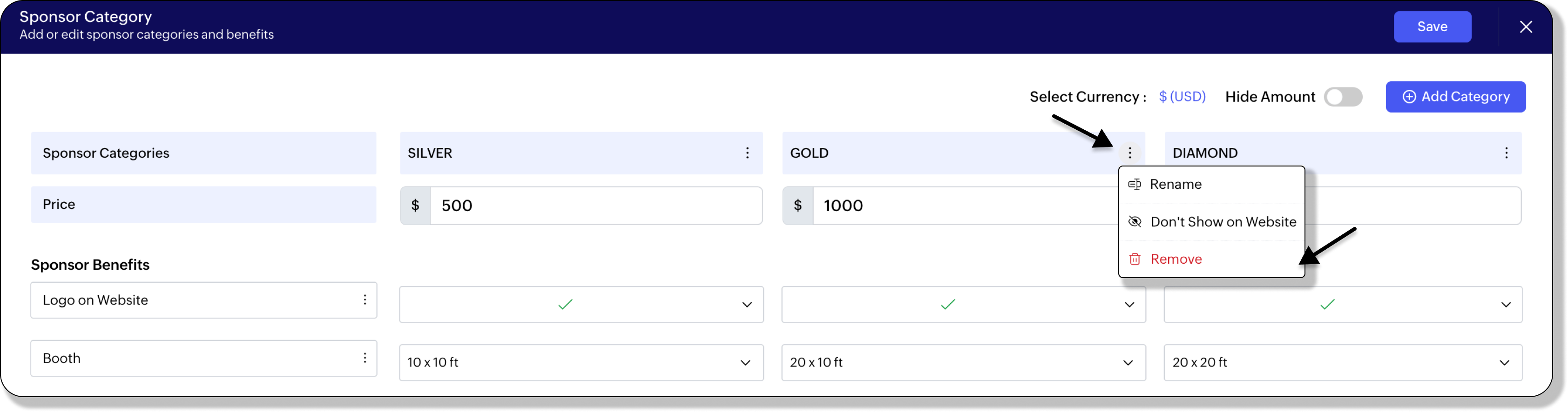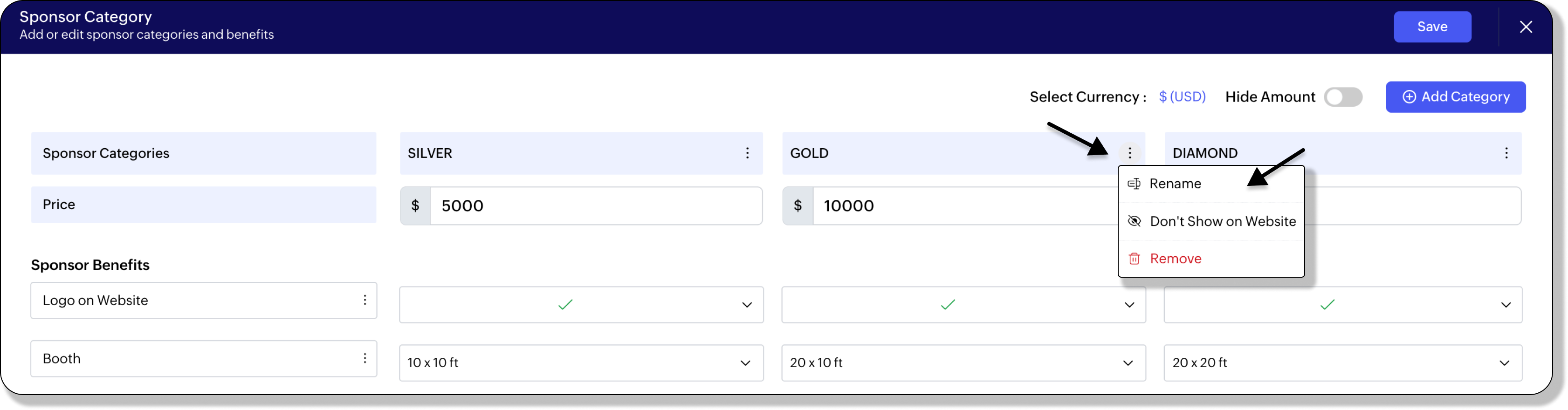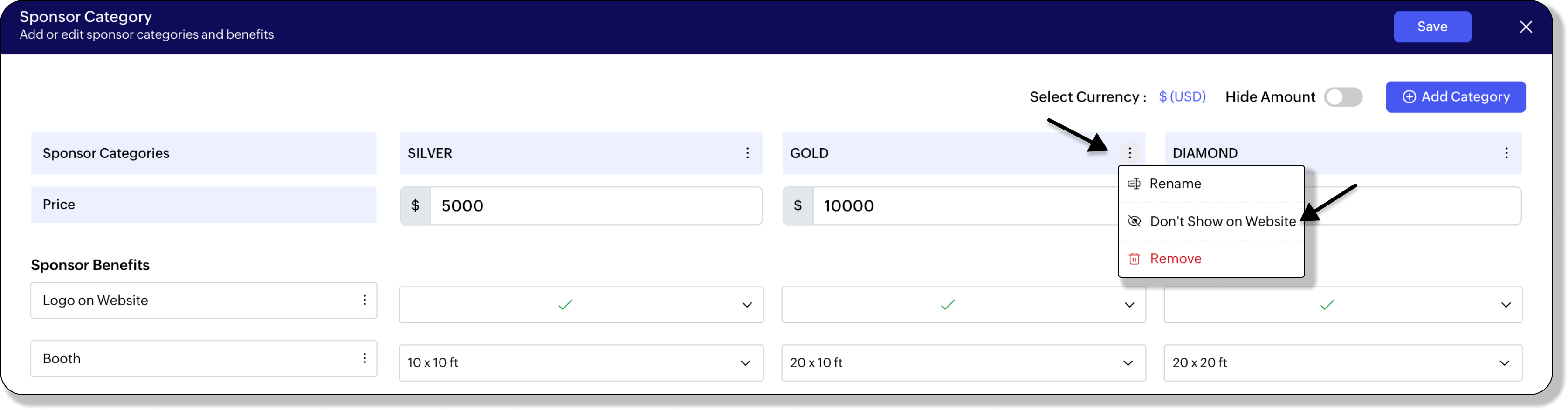 - Click the Options icon next to a sponsor category and select Show on Website.
