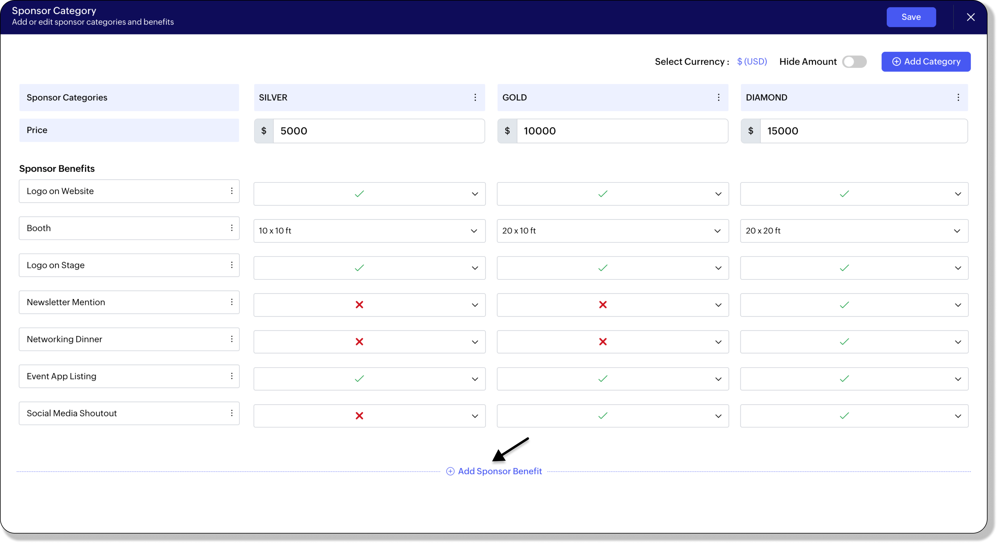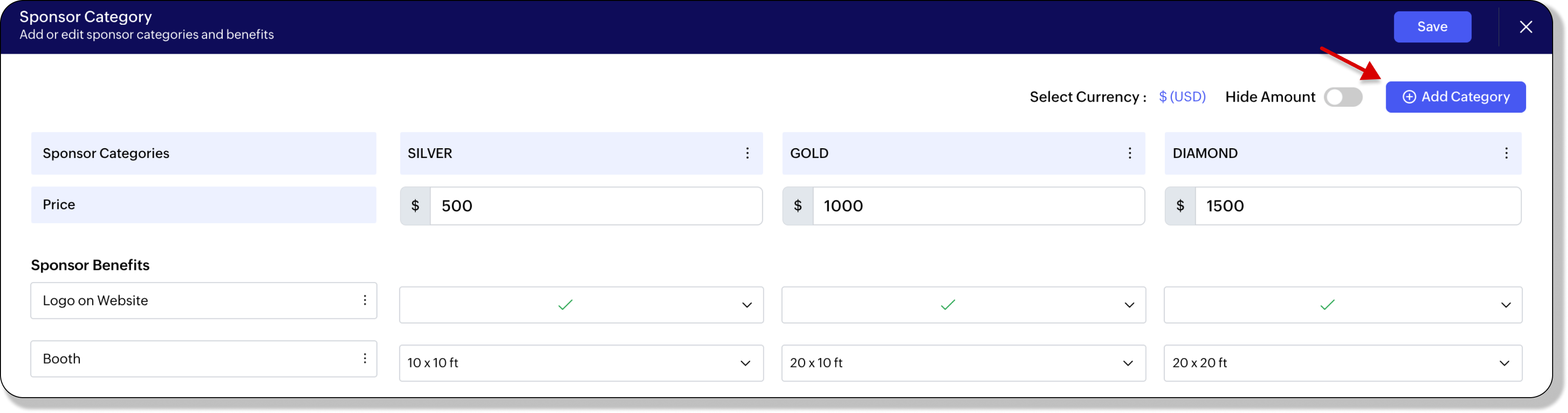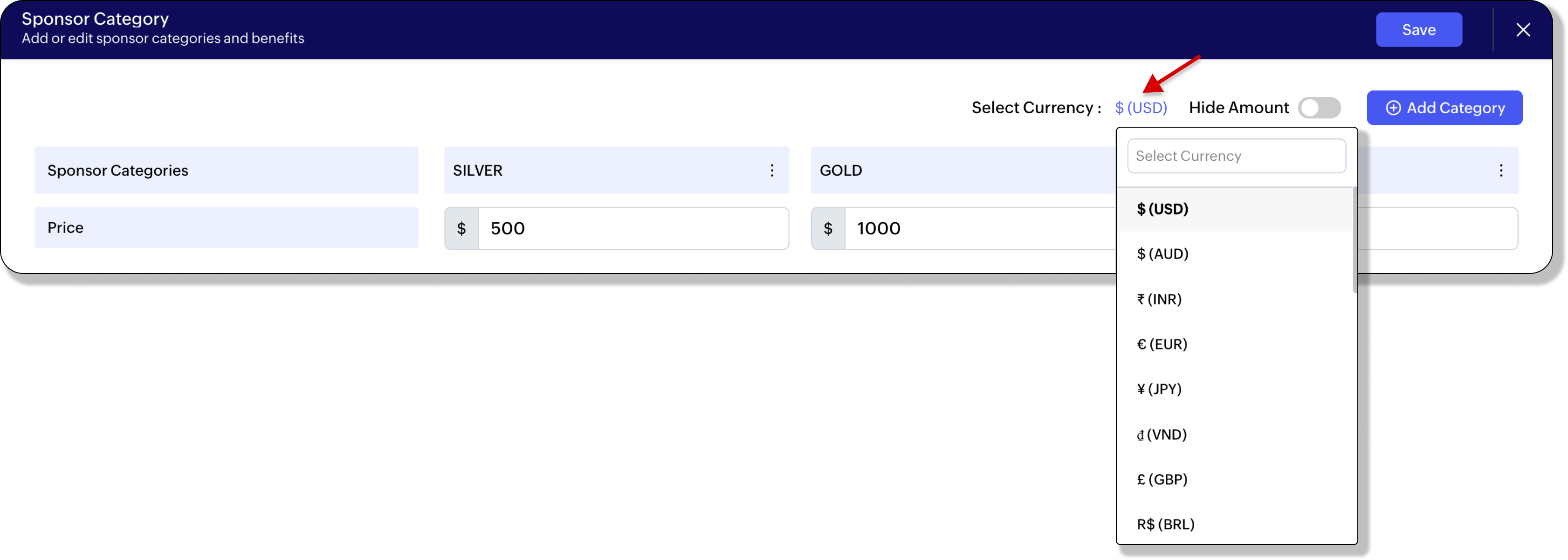Select Currency for your sponsorship prices. Enable the Hide Amount toggle to conceal the sponsor amount on the website, if necessary.