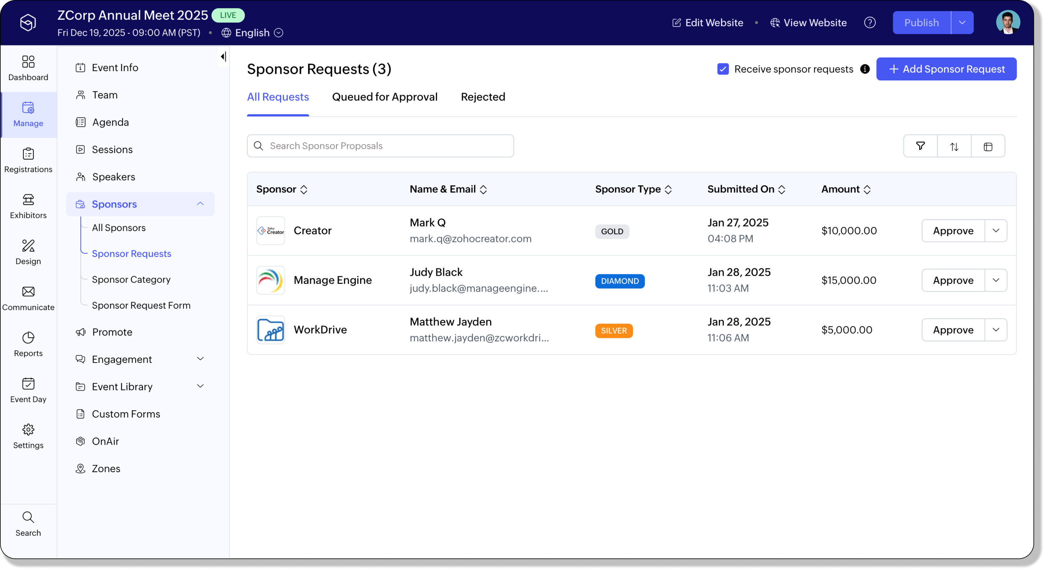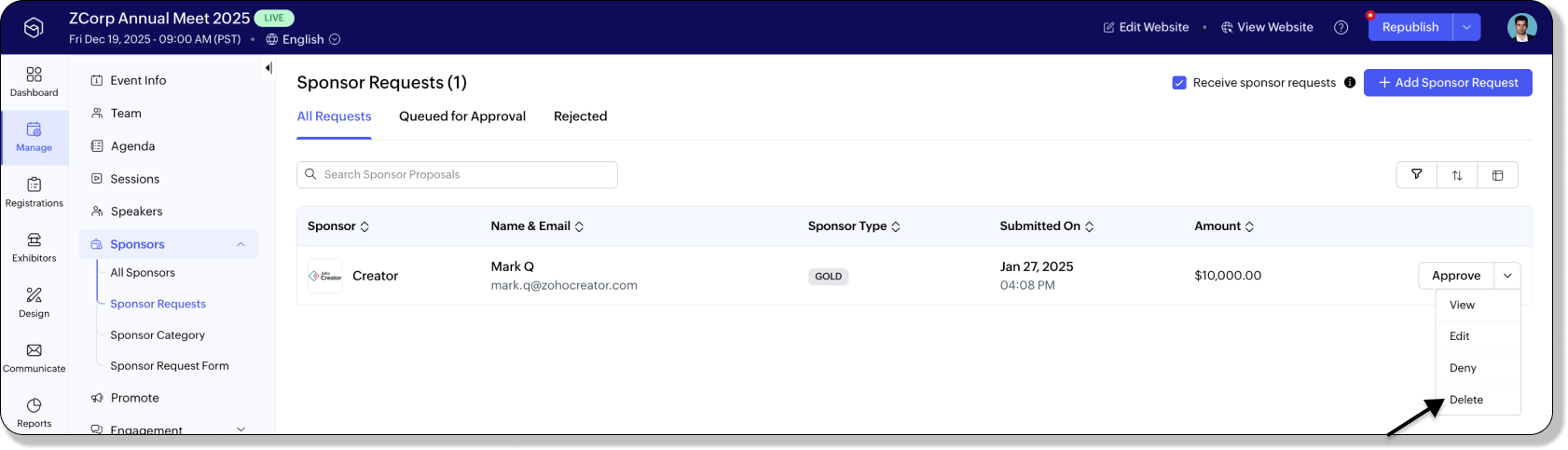 - Navigate to Manage > Sponsors > Sponsor Requests from the Dock.