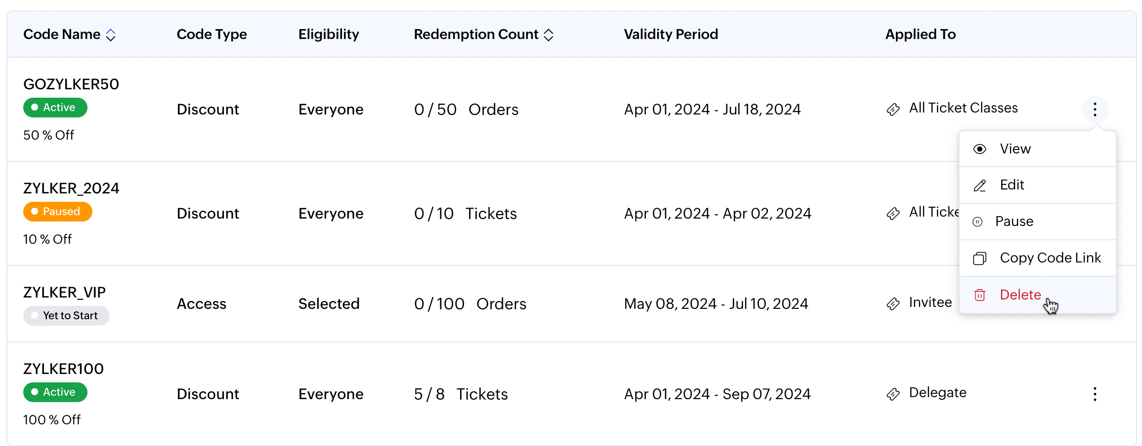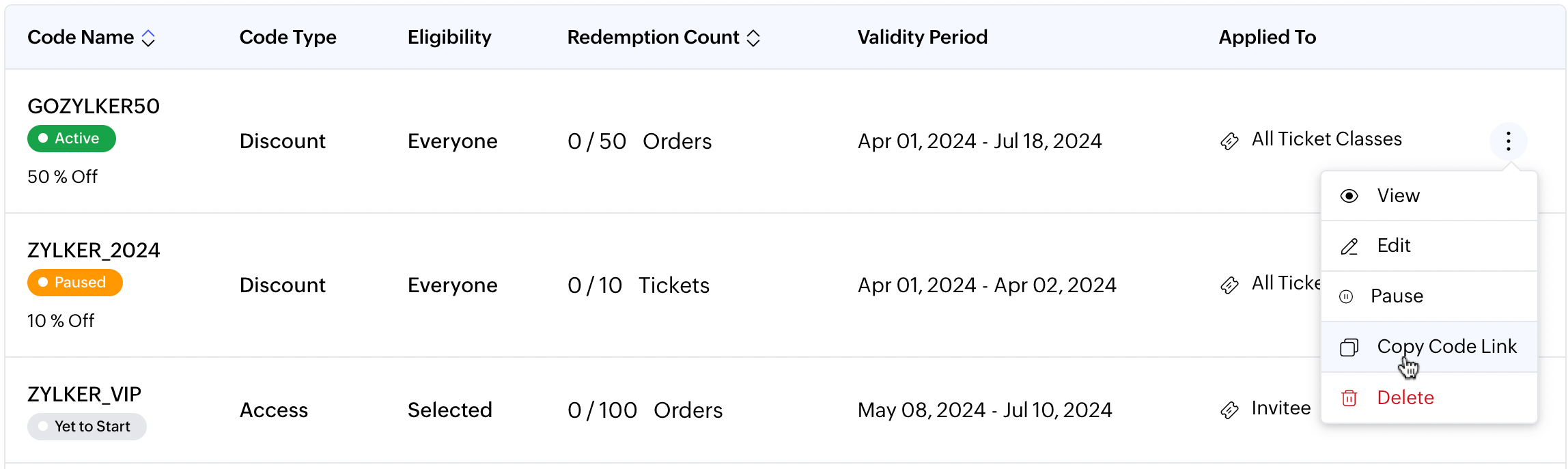 A discount code offers a reduction in the price of a ticket. Include discount codes in your promotional strategy to boost ticket sales.