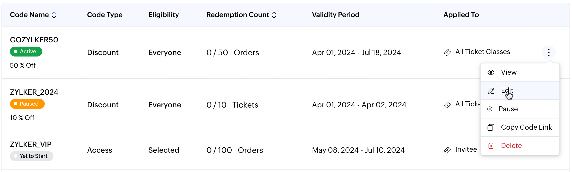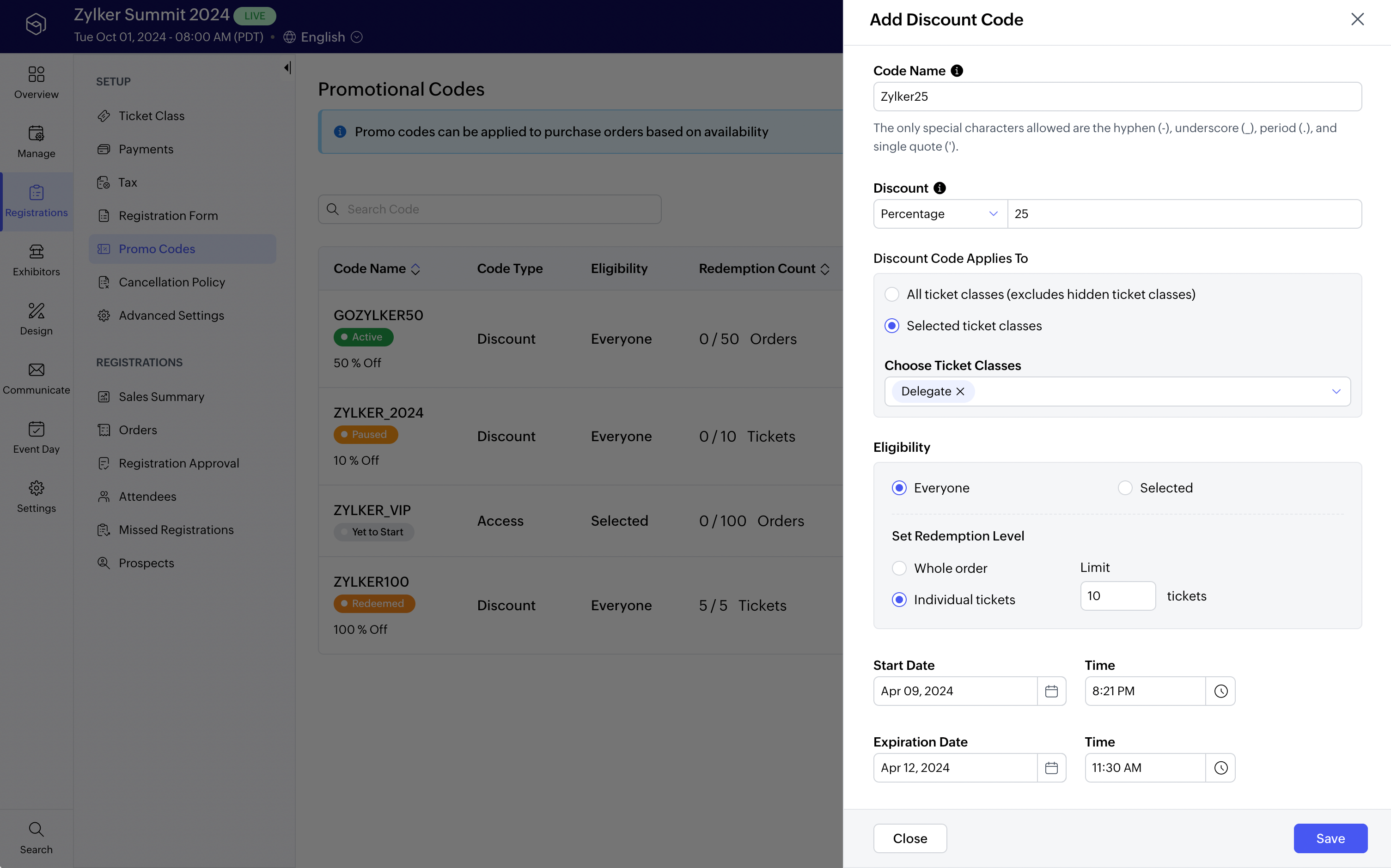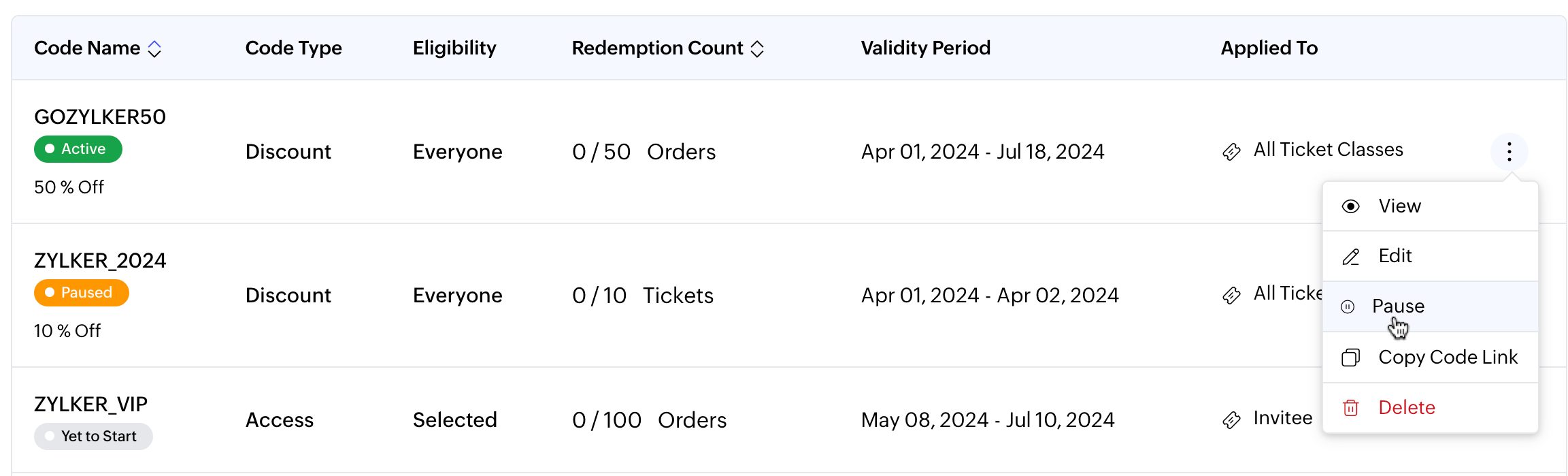 Note: Attendees will not be able to use a promotional code when it's paused.