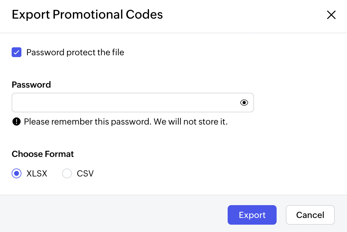 2. Click the Export button in the top-right corner. The Export promotional codes dialog box will display.