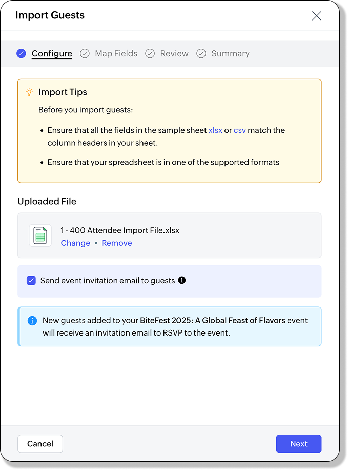 - Guests will receive RSVP invitation emails if the option is selected during import.