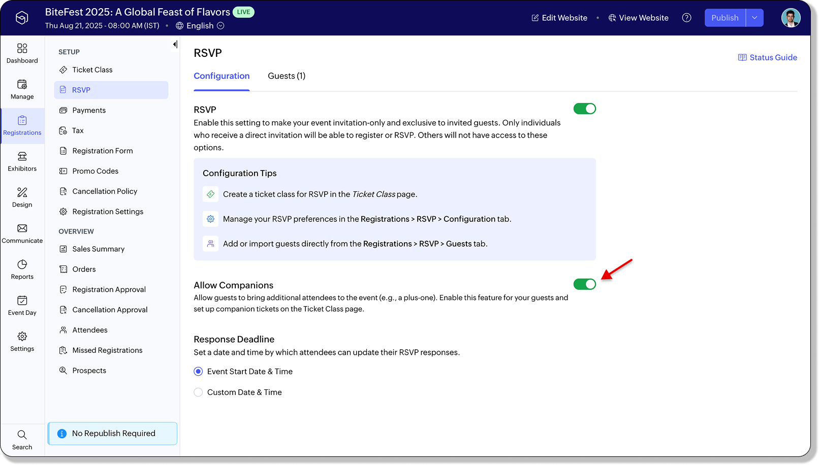 - Guests will see the option to register companions when they respond to their invite.