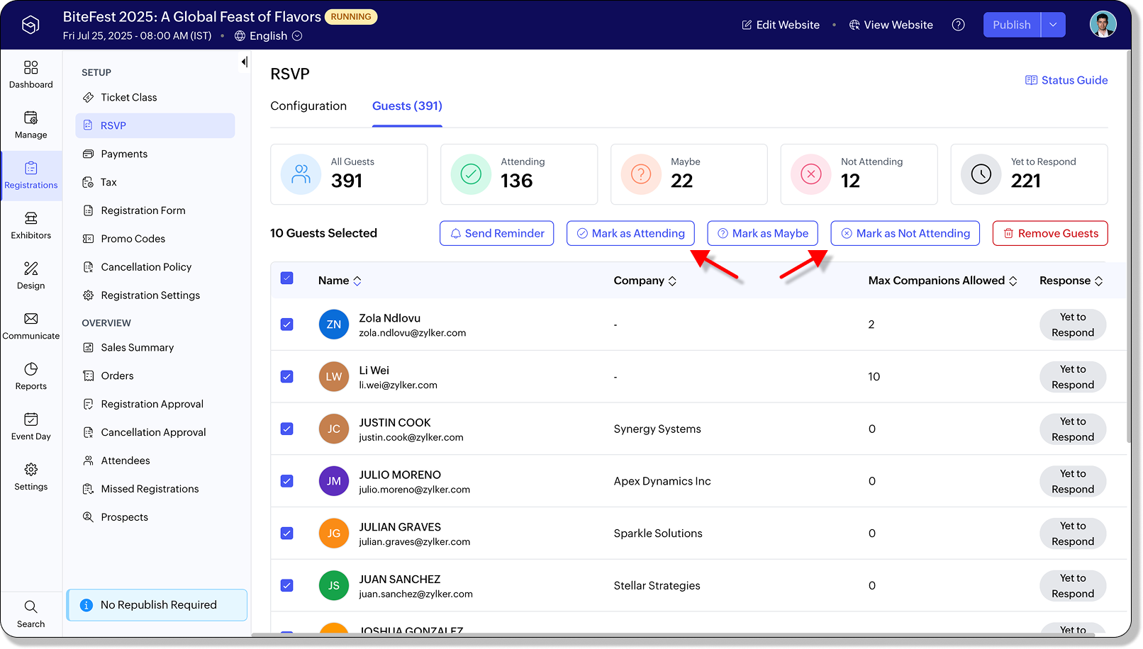 Use the Yet to Respond filter to ensures you capture last-minute confirmations without sending duplicate reminders to those who’ve already responded.