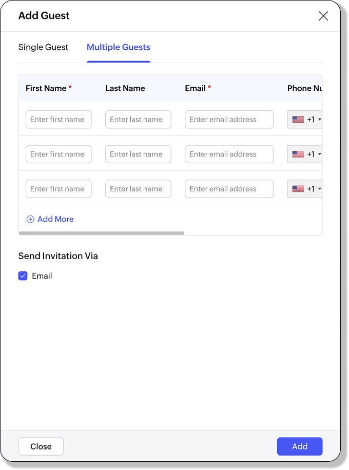 - Click Add More to insert another row of fields for guest details. You can repeat this step to add as many guests as needed.