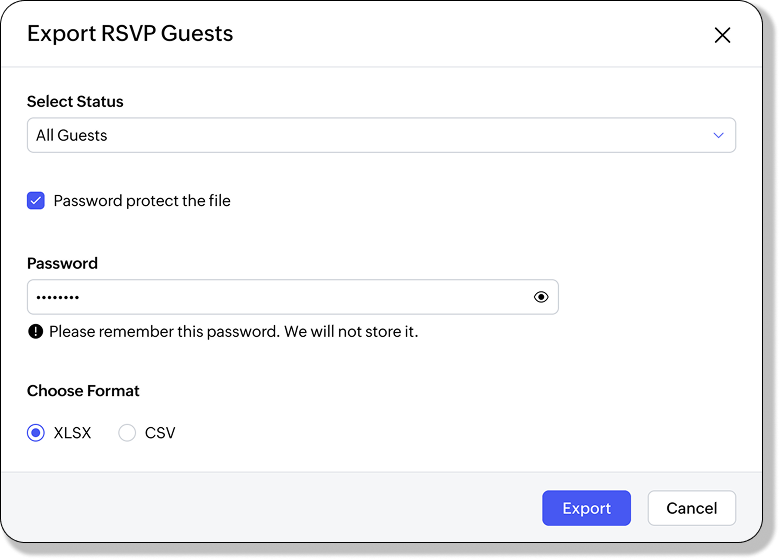 - Open the menu in the top right corner and click Export. The Export RSVP Guests dialog will appear.