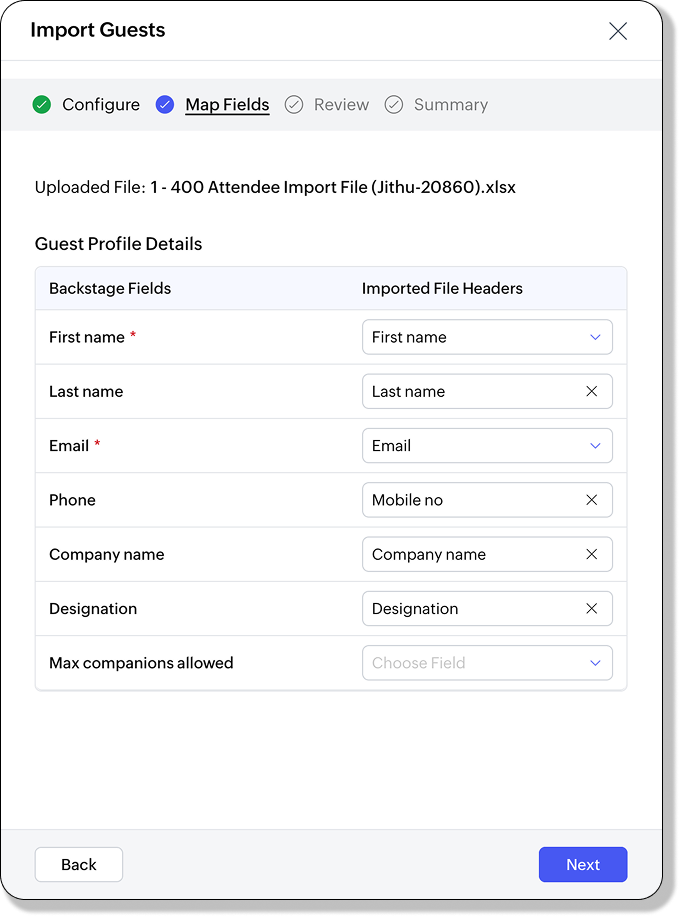 - In the Map Fields section, all guest fields from your Zoho Backstage RSVP form will be shown on the left.