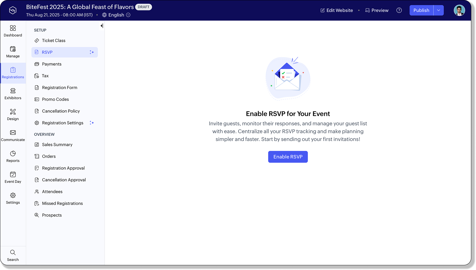 Once RSVP is enabled, the event becomes invite-only. Only those who receive a direct invitation will be able to register or submit their RSVP. Registration access for others will no longer be available through the event site.