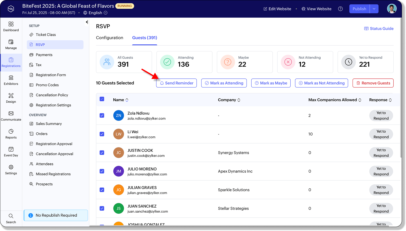 - For multiple guest, use the checkboxes to select them and click Send Reminder.