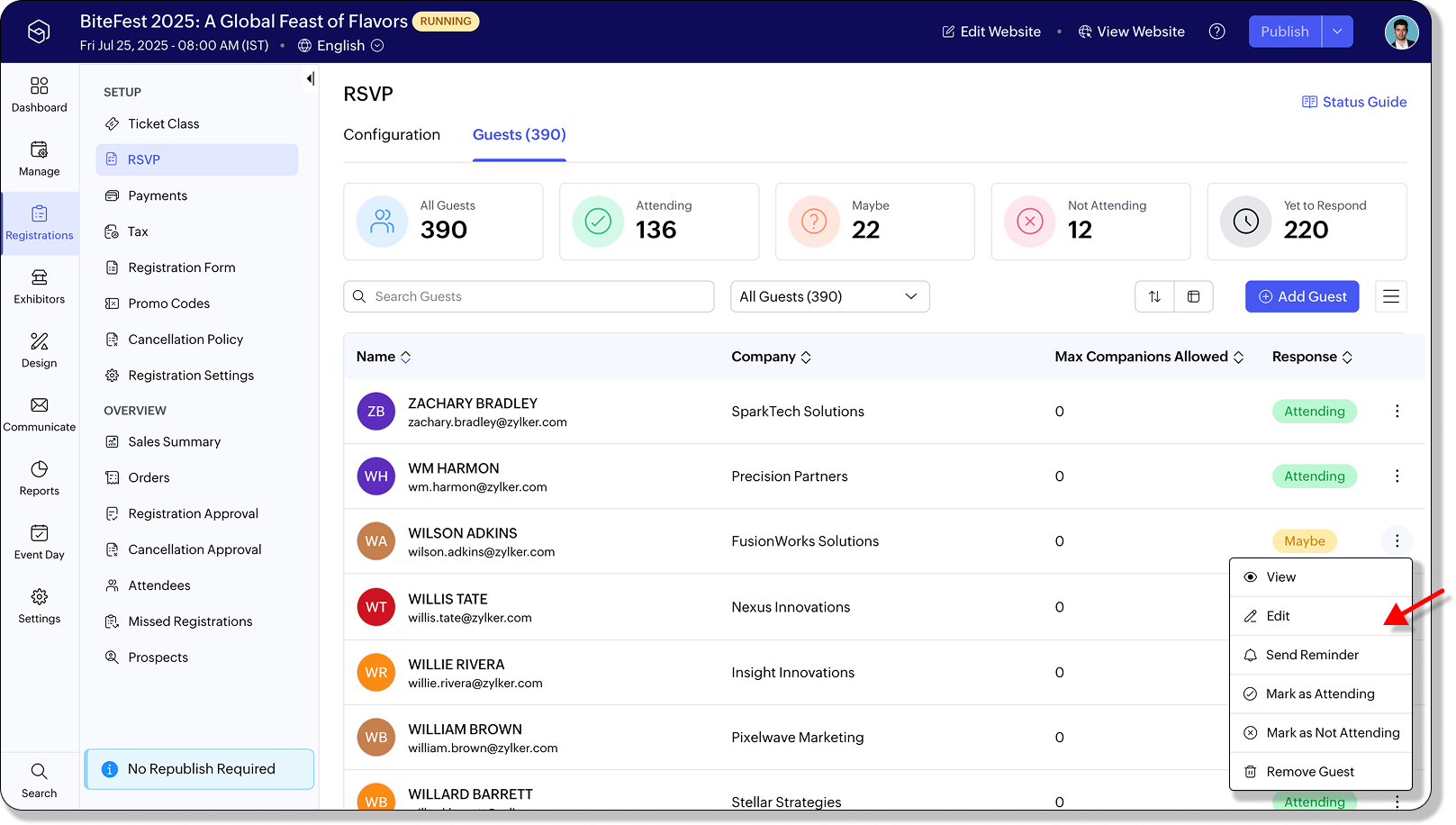 RSVP in Zoho Backstage helps you manage invited guests efficiently, track their attendance status, and streamline communications throughout the event planning process. Whether you’re inviting a few select individuals or importing a full guest list, this guide walks you through the entire workflow — from adding guests to marking their responses.