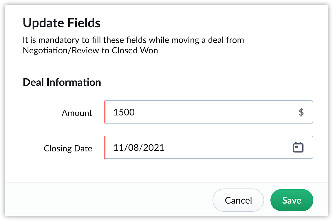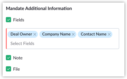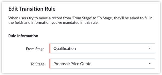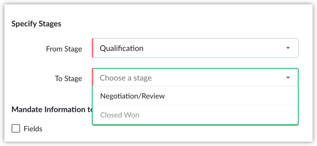 Fields: The user must fill out certain fields in order to transition the record to a different stage.