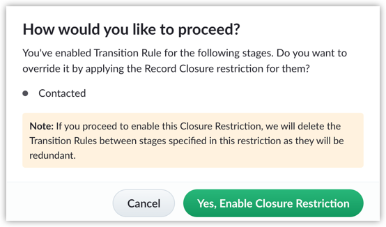 Notes: The user must add a note to the record to move the record from one stage to another.
