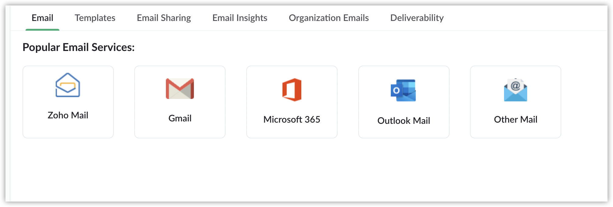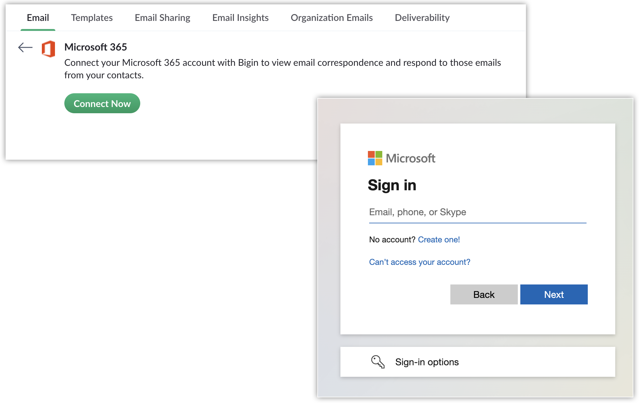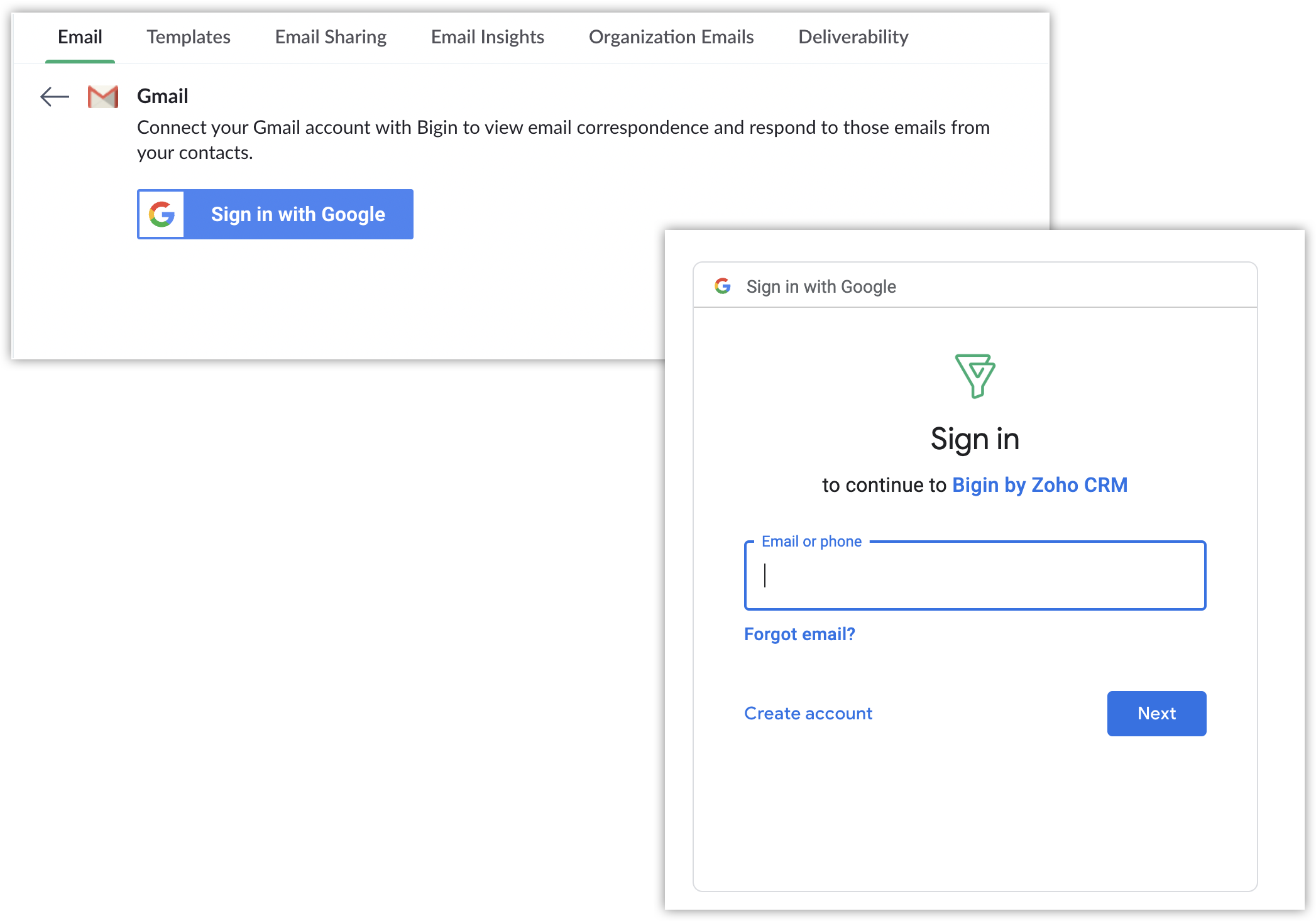 2. For Gmail, Microsoft 365 and Outlook Mail services, sign in to the respective email account directly from Bigin.