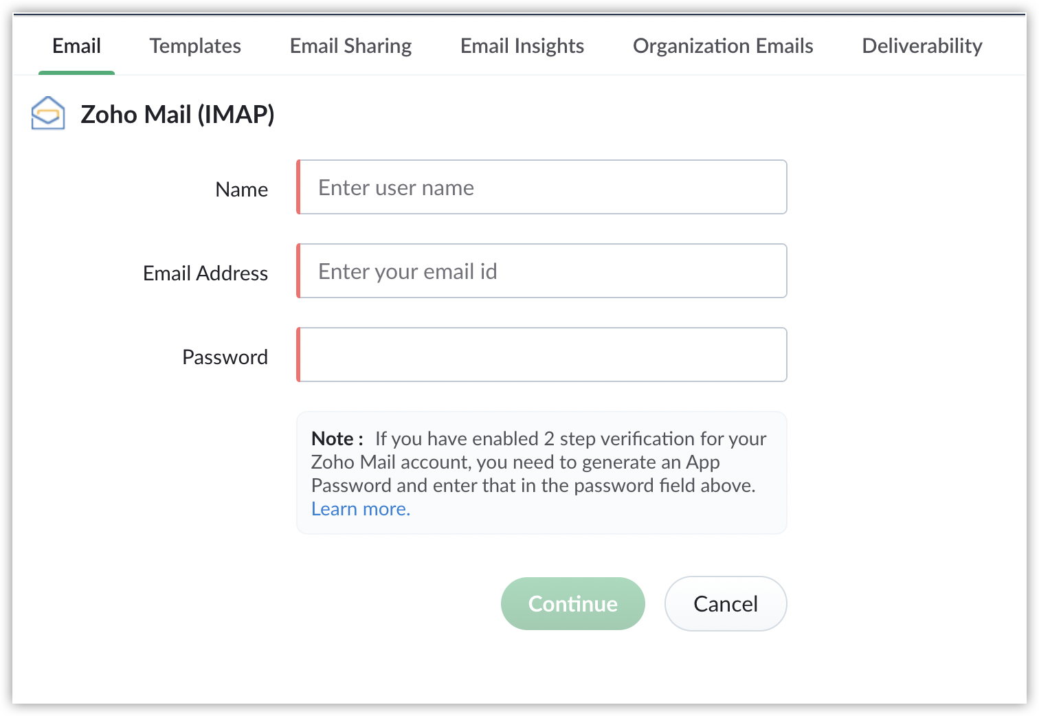3. For Zoho Mail and Other Mail, enter  UsernameEmail Address,  Password and click  Continue. Some Email services require an app-specific password to configure  in Bigin. To learn more about app-specific passwords, read Generate App Specific Passwords.
