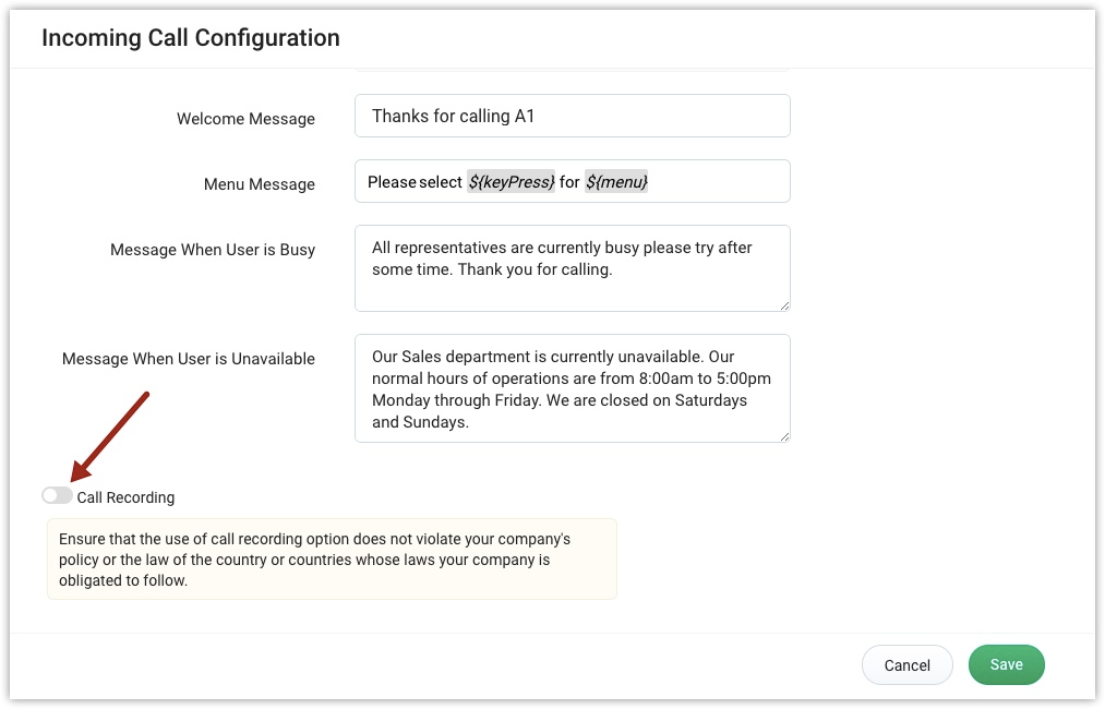 3. Under the Incoming call routing section, enable the Call Recording button.