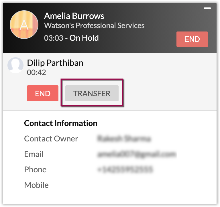 - Once that agent attends the call, you can inform the second agent about the customer's requirement. And then, click the Transfer button.