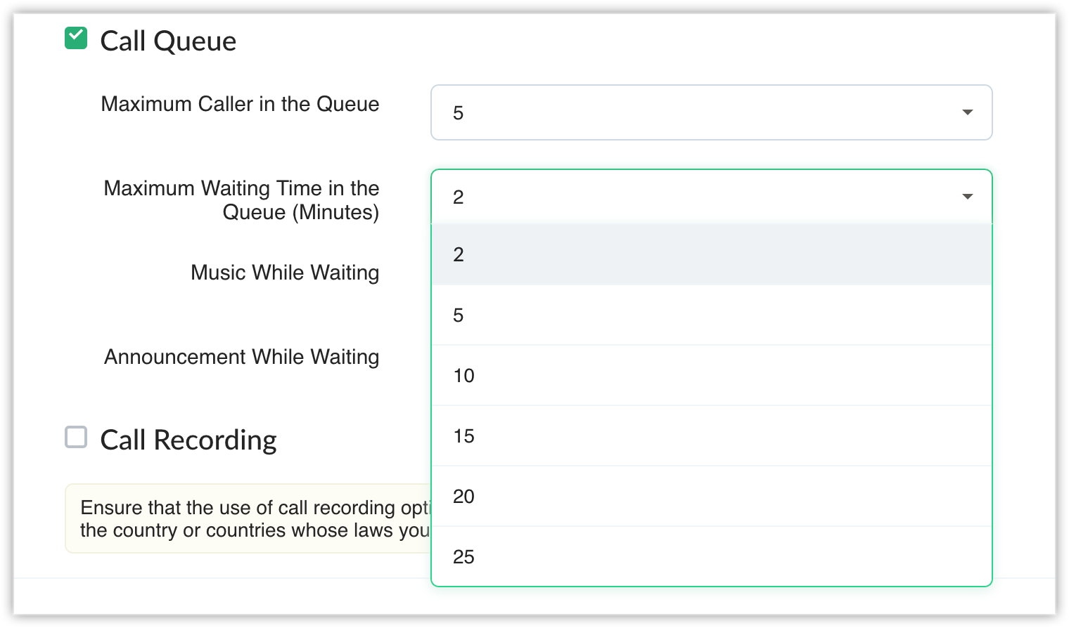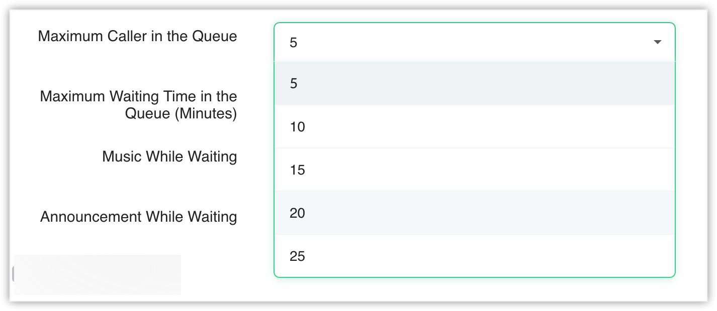 Maximum Callers In the Queue: This denotes the maximum number of callers you want to be present in the queue at any given time. You can choose up to 25 callers.. Every incoming call that is received after exceeding the maximum caller queue length will be routed to a message stating the agents are busy.