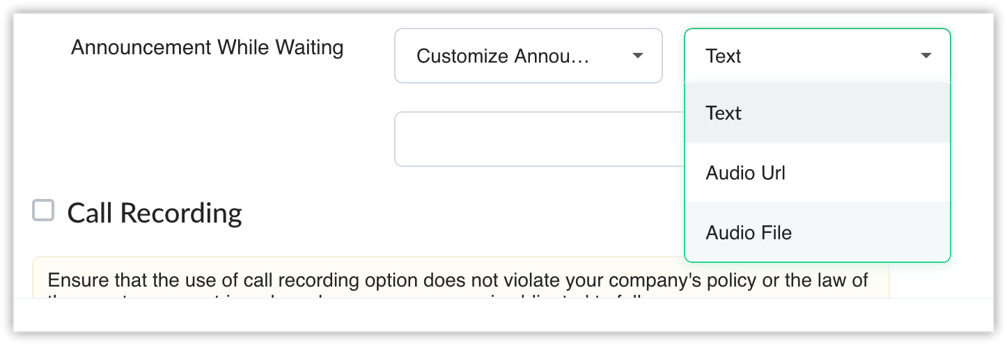Announcement while Waiting: This denotes the announcement that will be played at regular intervals while the caller is waiting in the queue. You can either add a custom announcement (in file/url/text) of your choice or choose the default announcement available here. For instance, when you transfer the call to another agent you can play an announcement like 'Please wait while we transfer your call to another agent'.