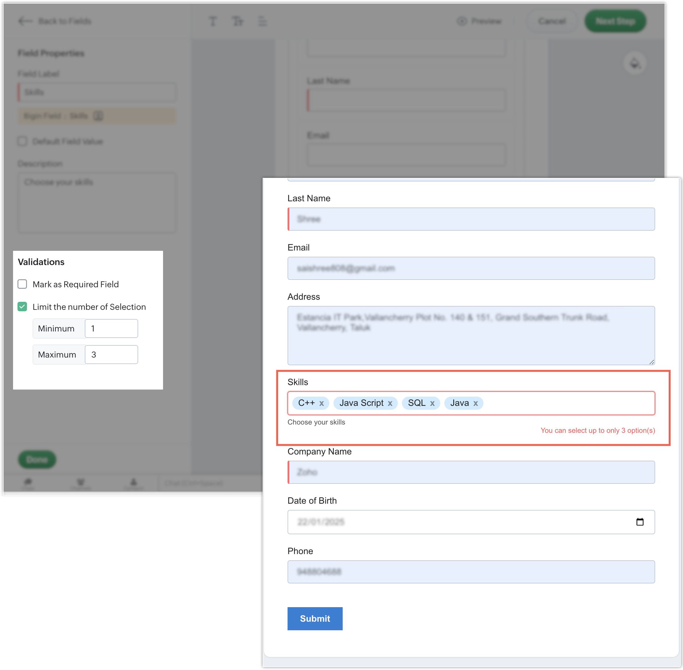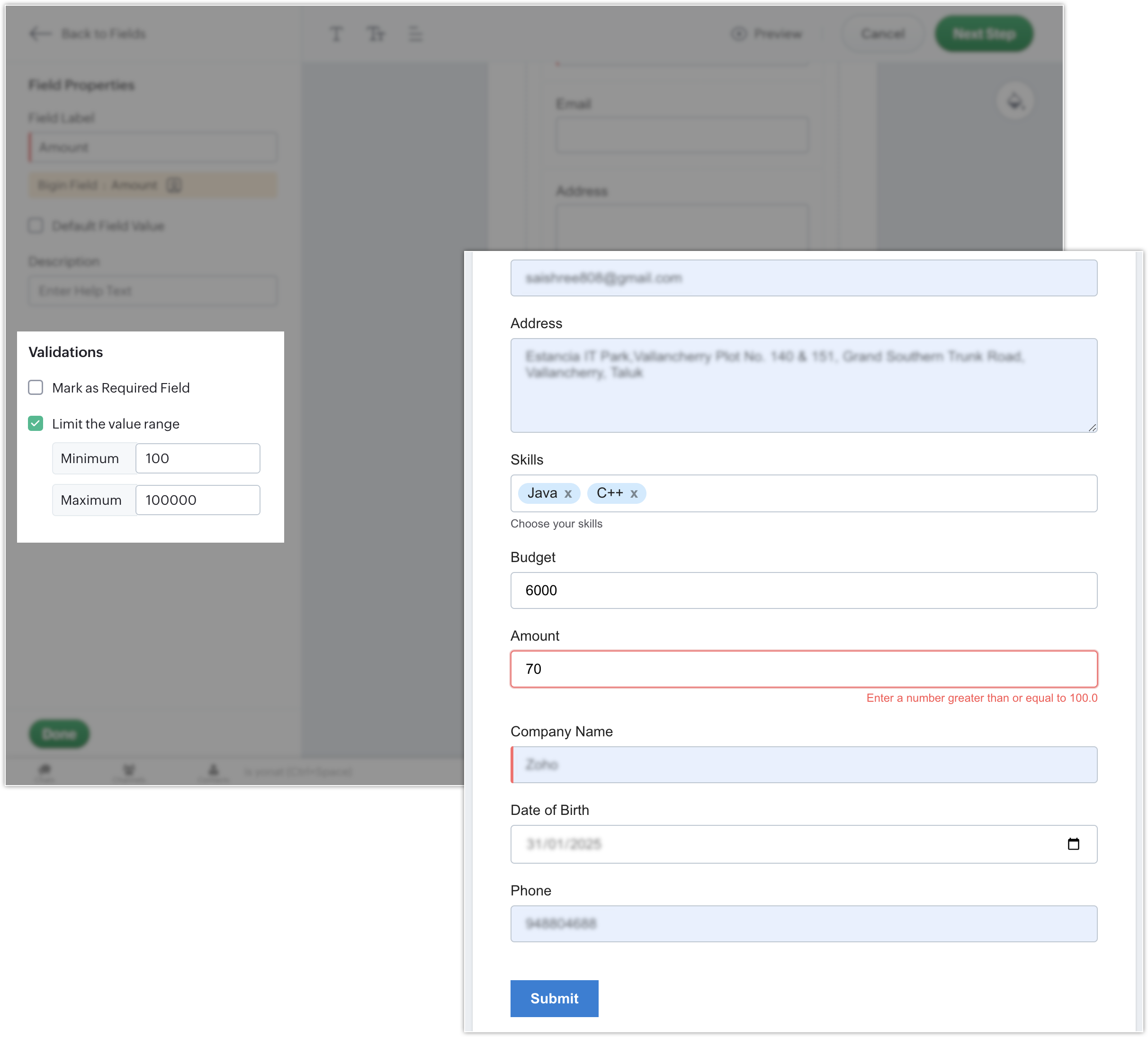 Forms are an essential tool for collecting information from the public. However, submissions may sometimes include inaccurate, incomplete, or improperly formatted data, potentially disrupting business operations. To address this, the Form Field Validations feature allows you to define validation rules for each field, ensuring accurate and reliable data collection.