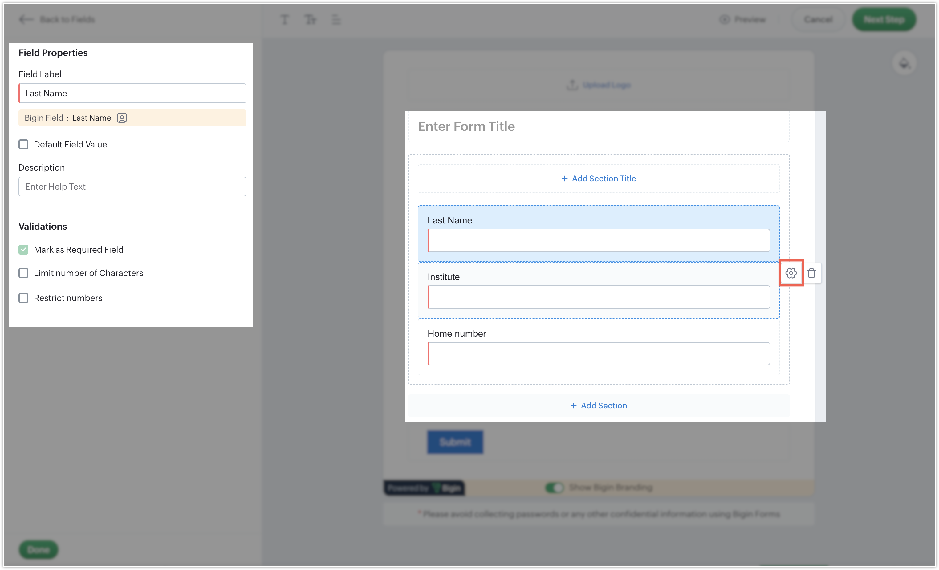 To add field validations to forms, navigate to Setup > Forms > Create Form/Existing Form. Hover over the field you want to validate, click the settings icon next to it, and configure your validations.