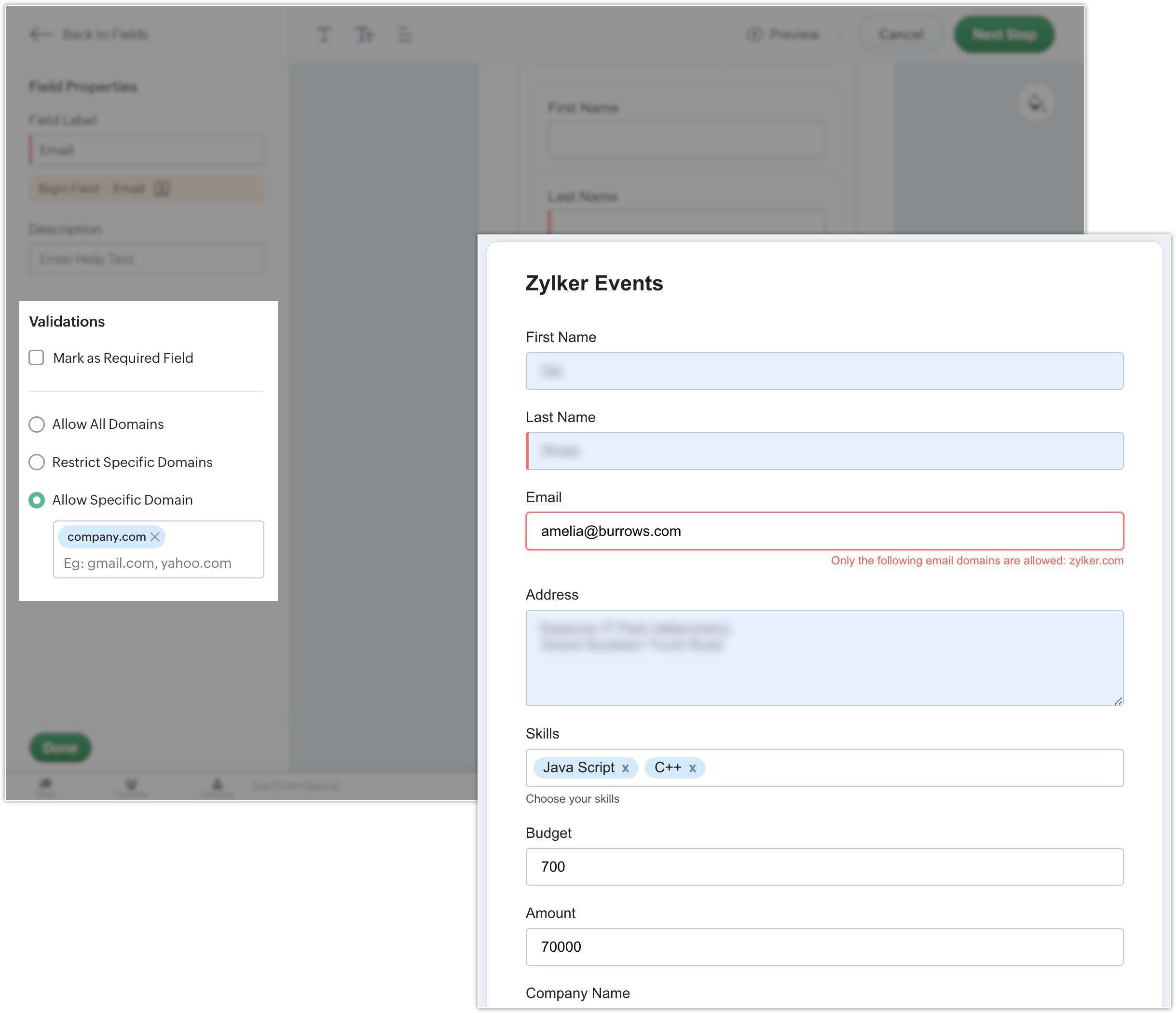 | Allow Specific Domains | The field only accepts email addresses from specified domains (e.g., "company.com"), blocking others. | "user@company.com" | "user@gmail.com" |