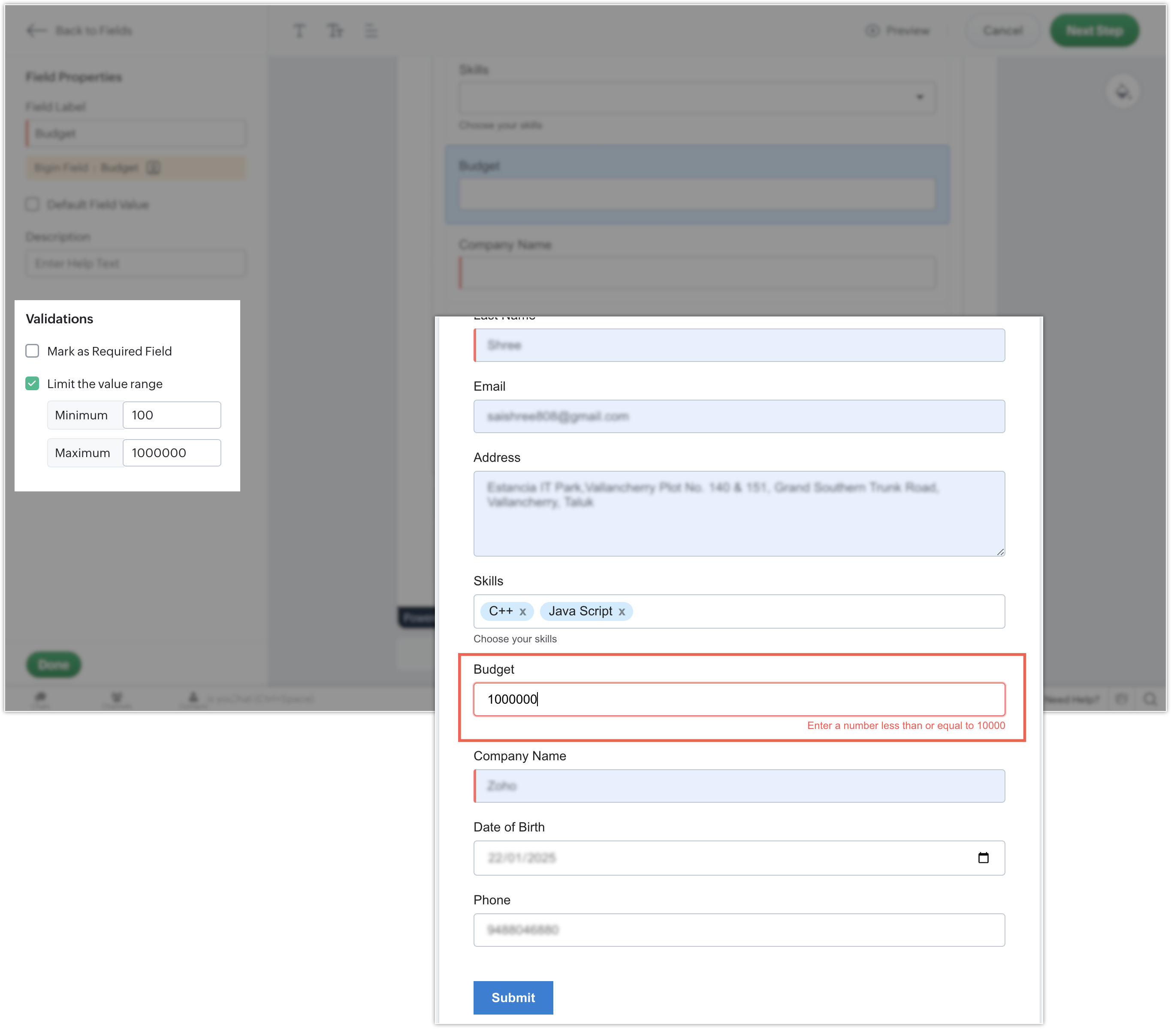 Number, Decimal, Percent, Long | Value Range Limit (Min, Max) | The input must be a number within the specified range (e.g., values outside 1 to 100 are rejected). | "50" (within 1 to 100) | "150" (exceeds 100) |