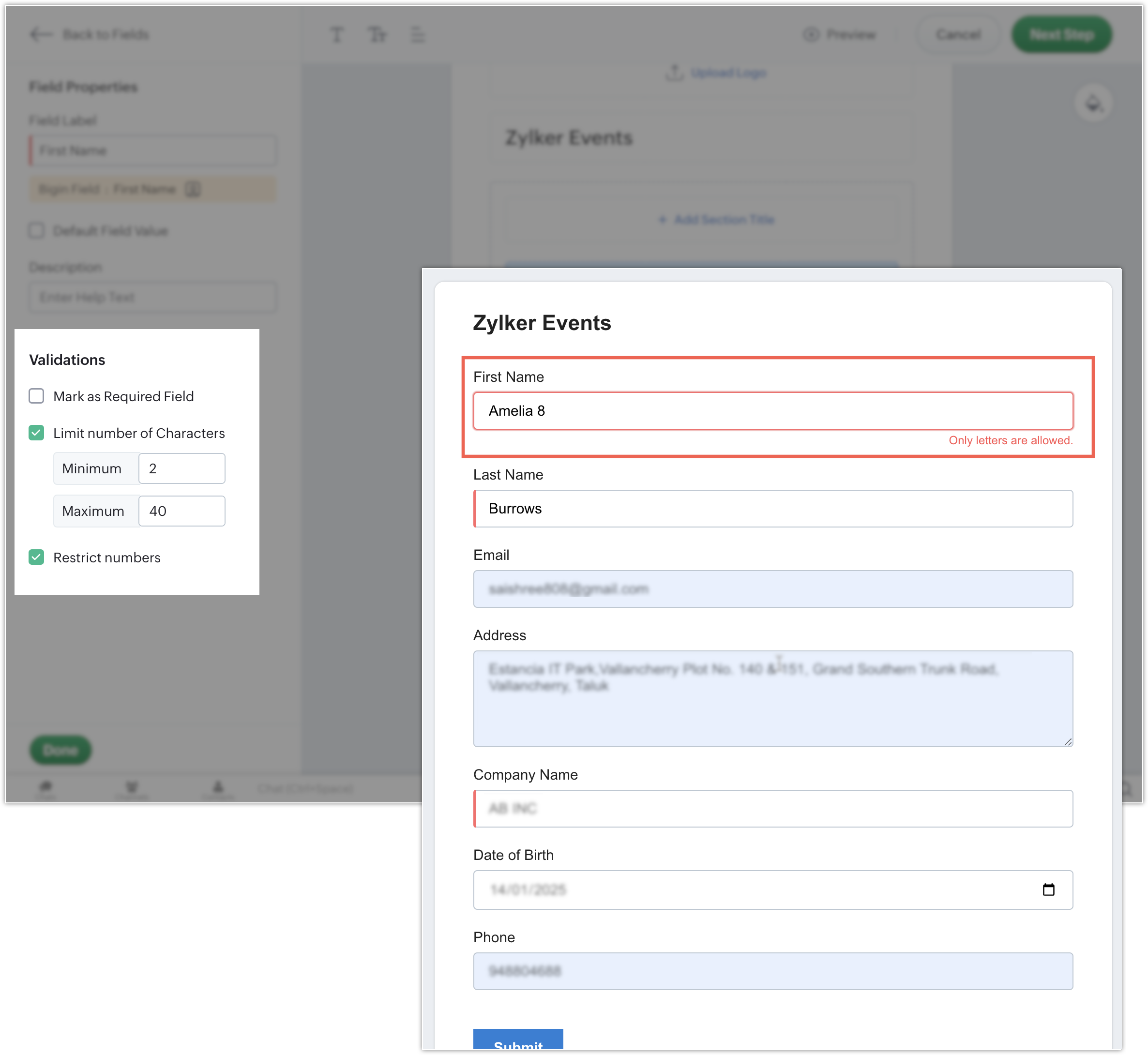 Restrict Numbers | The field only accepts alphabetic characters, blocking numeric or special characters from being input. | "Alice" | "12345" |