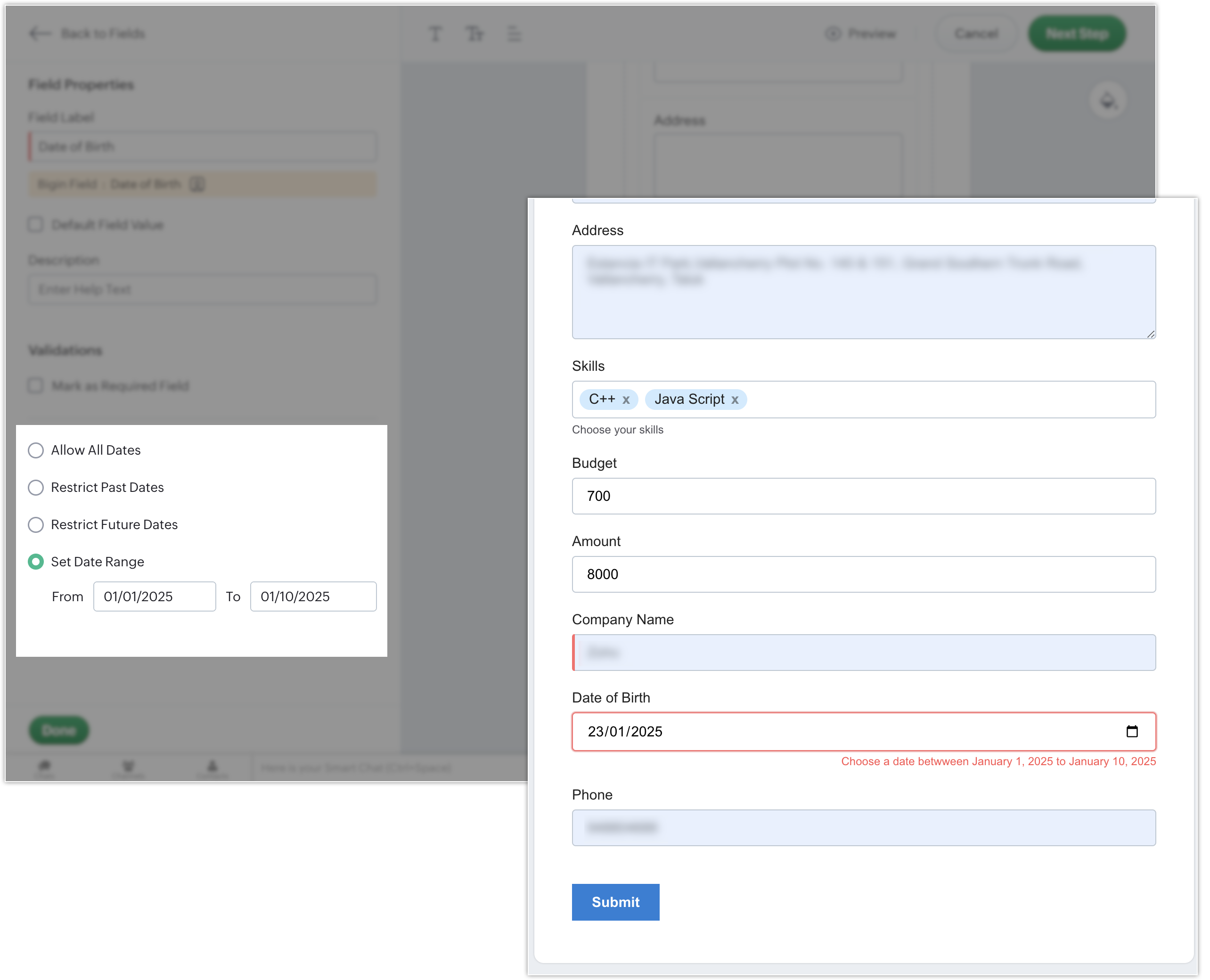Set Date Range: The input must fall within a specific date range, such as dates in January 2025 only. A date within January 2025 is valid, but a date outside this range is invalid.