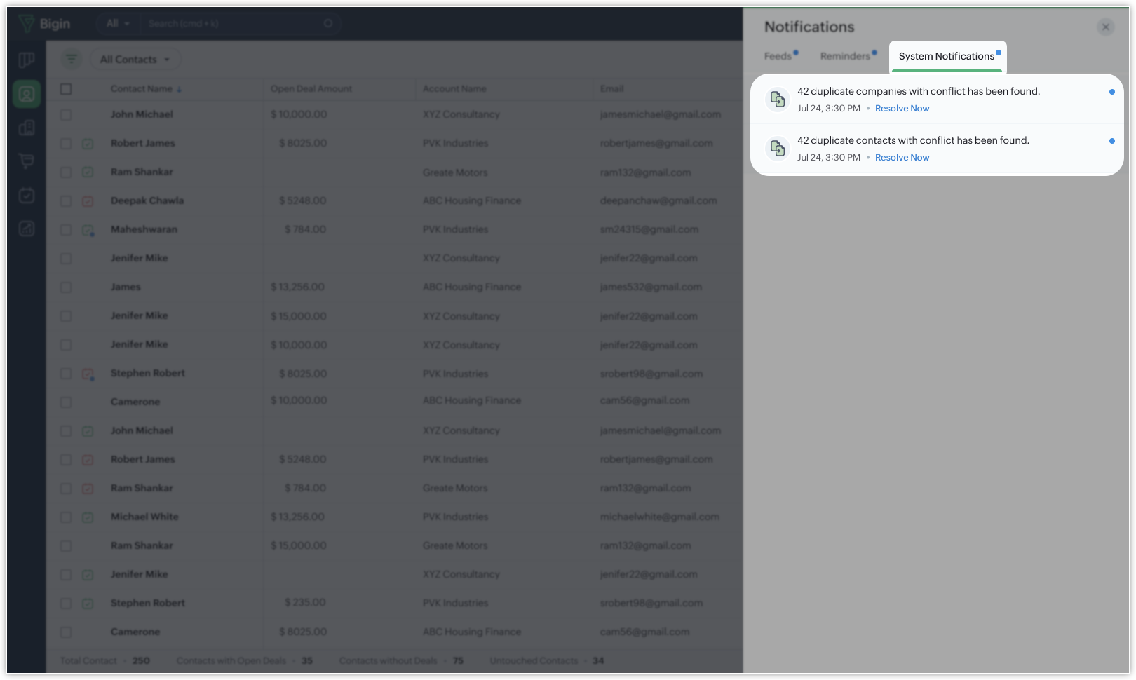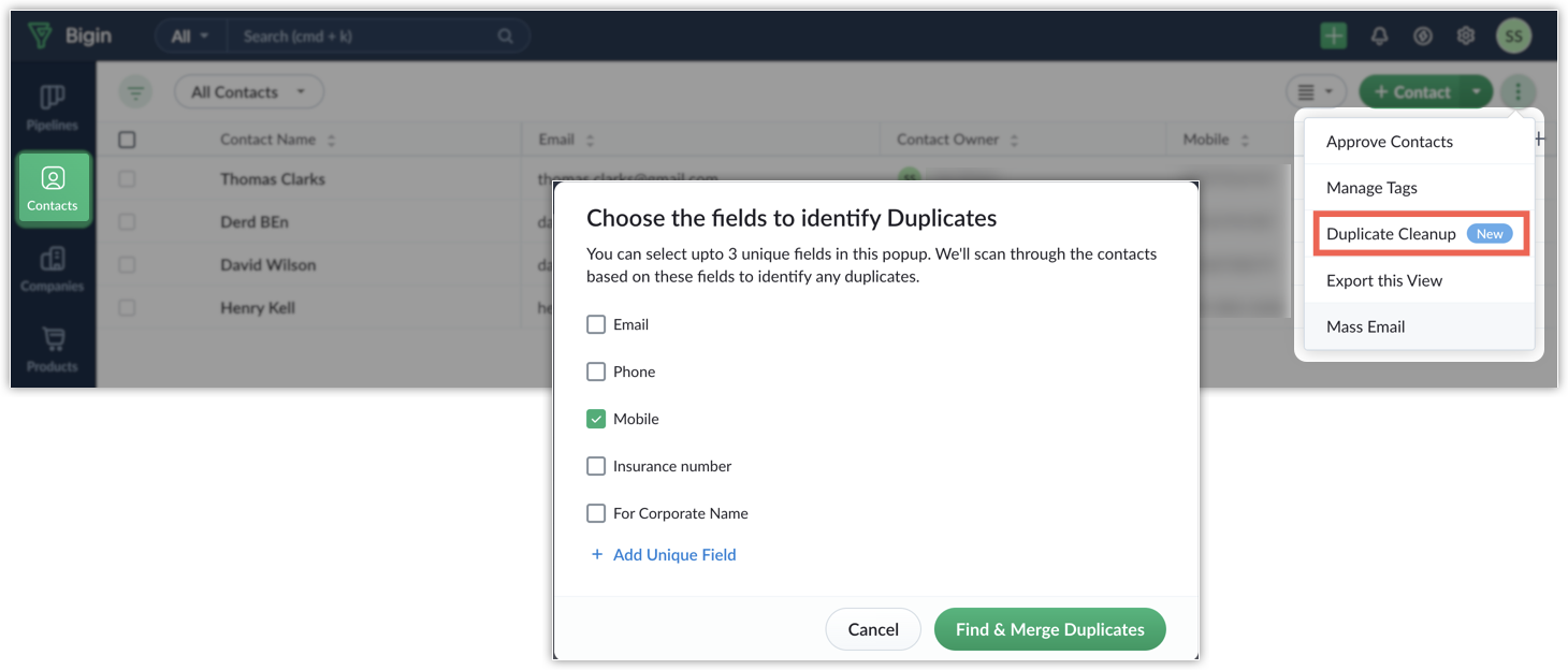 To address these problems, Bigin has a de-duplicating feature called "Duplicates Cleanup" for the Contacts and Companies modules. You can identify the duplicates in your database by regularly reviewing the data in these modules based on certain conditions and merging duplicate records together using this feature.