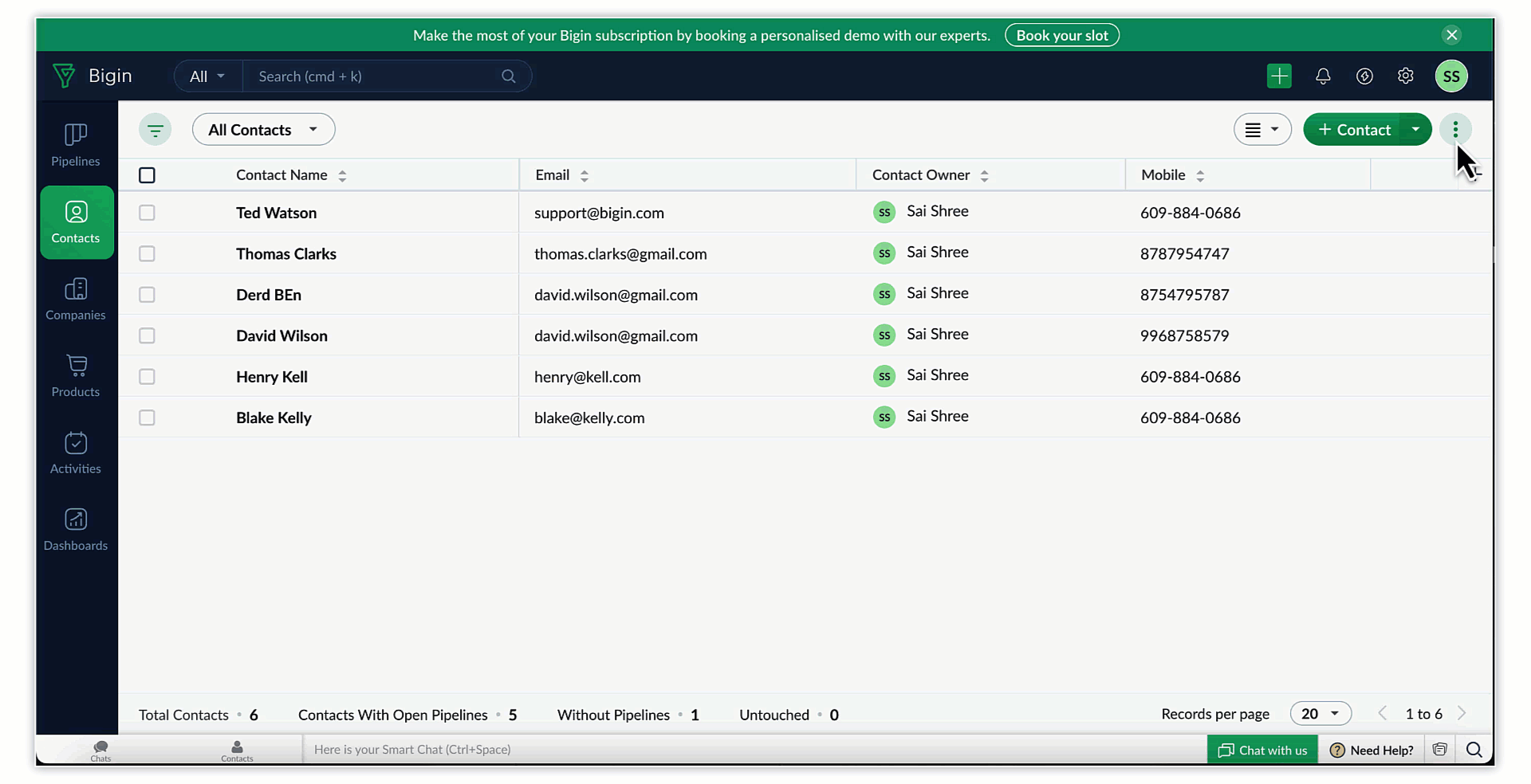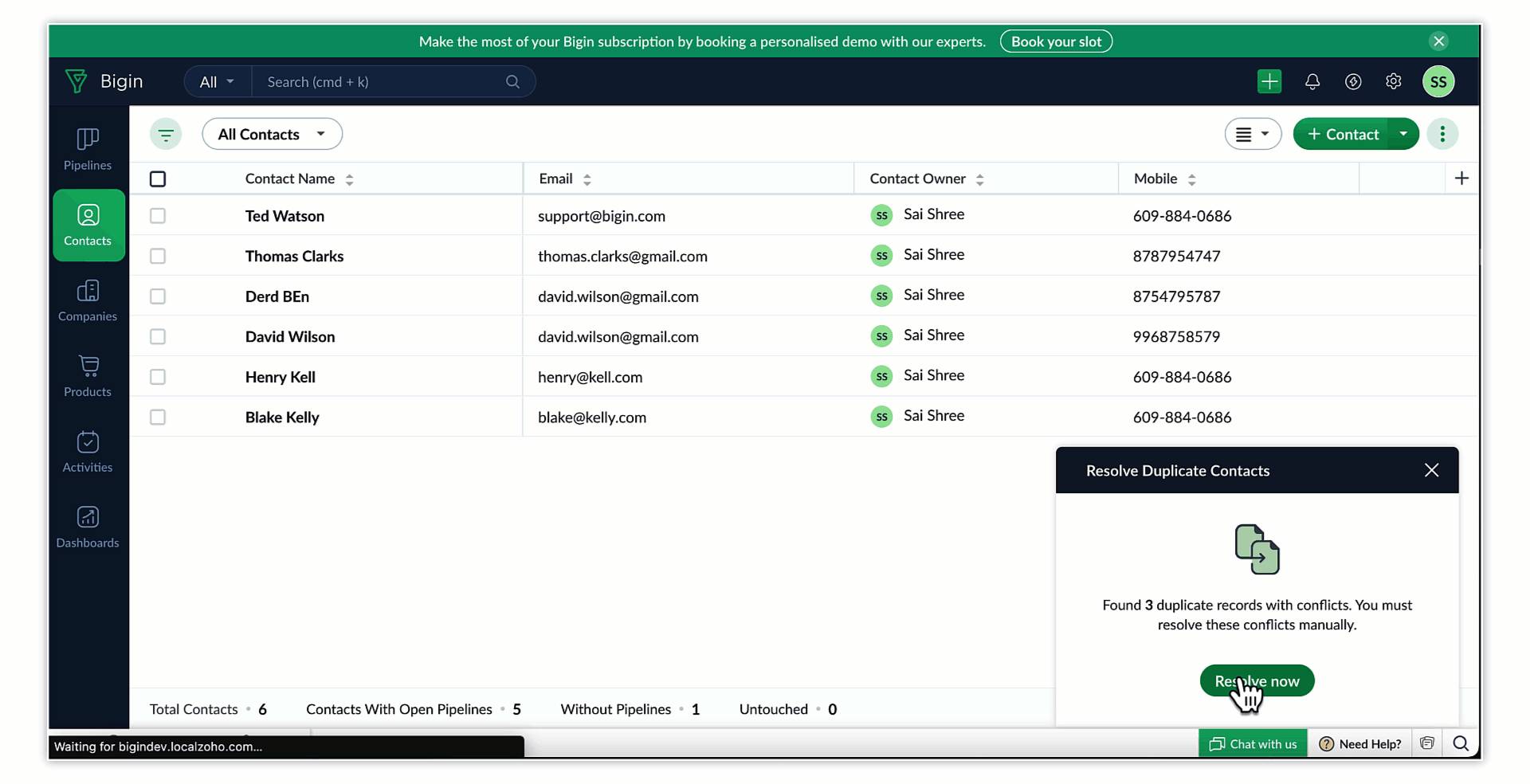 However, because they're adding so many contacts each day through different sources, sometimes the same contact gets added twice. Let's say one of the sales representatives of the landscaping company has added a few contacts they received as referrals. The same contacts have already filled out the webform on the company's website, and now they're added again to Bigin without the representative realizing that these contacts were already in the system.