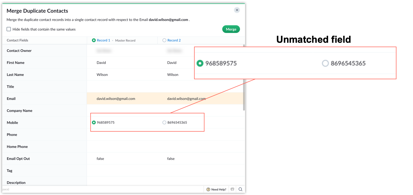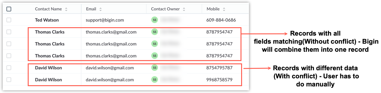 Records with conflicts: Consider another set of two duplicate records with different values in the Mobile field, which will result in conflict. Bigin won't merge them automatically; the administrator has to merge and resolve them manually. Even if other fields have the same value, the Duplicates Cleanup method won't combine them, and it will only do the match on the unique field that you want to check for. The user has to choose the record manually to resolve the conflict.