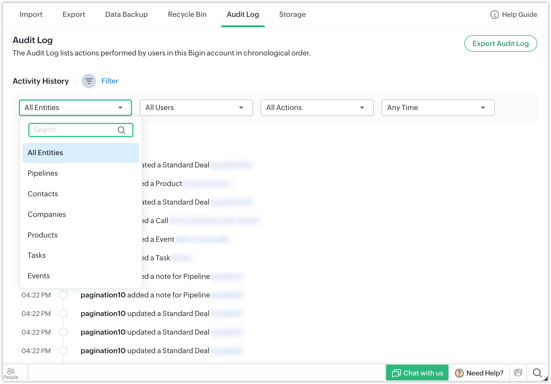 All the actions performed in your Bigin account will be listed chronologically in a single window. You can also choose to export a copy of the audit log for your reference.