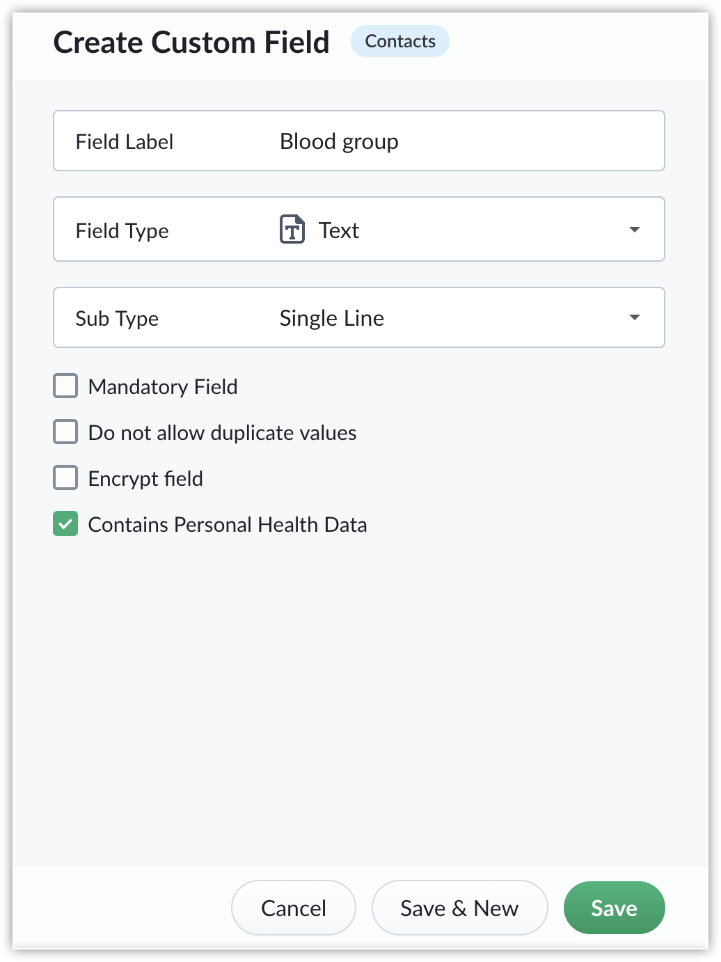 In the Contacts module, there may be only a few fields that contain personal health details of a customer. For example, surgical history, symptoms, medication details, etc. marking these fields as PHI will help the system identify and restrict access to these fields through API and prevent the export of these field values. A total of 30 fields can be marked as PHI fields.