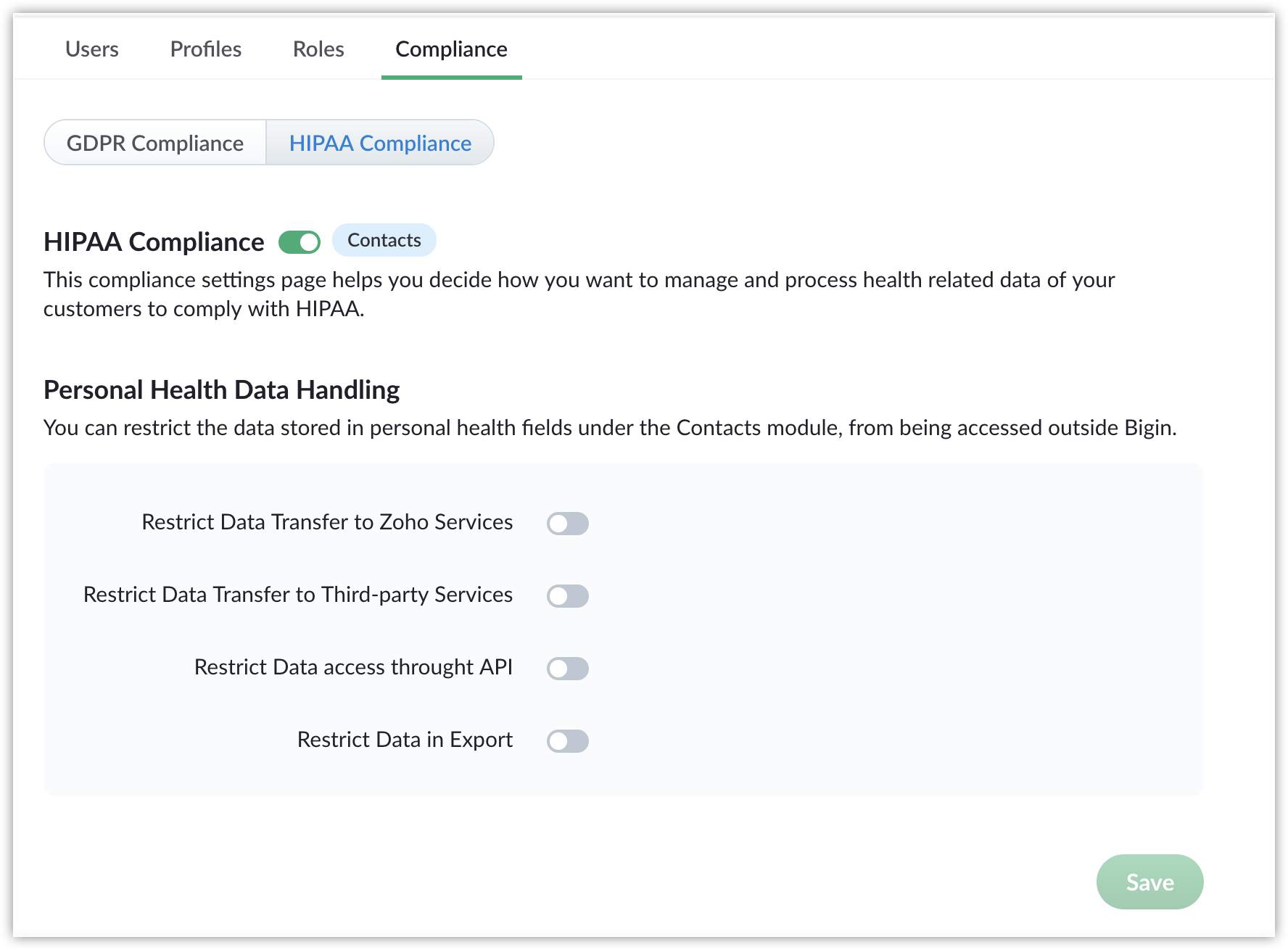 Remember that this option will only appear if HIPAA compliance is enabled in your Bigin account.