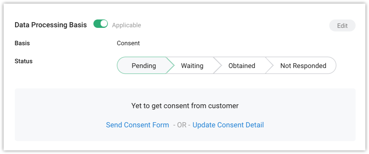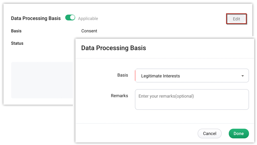 3. Mark the Data Processing Basis as Applicable and select Consent from the drop-down list.