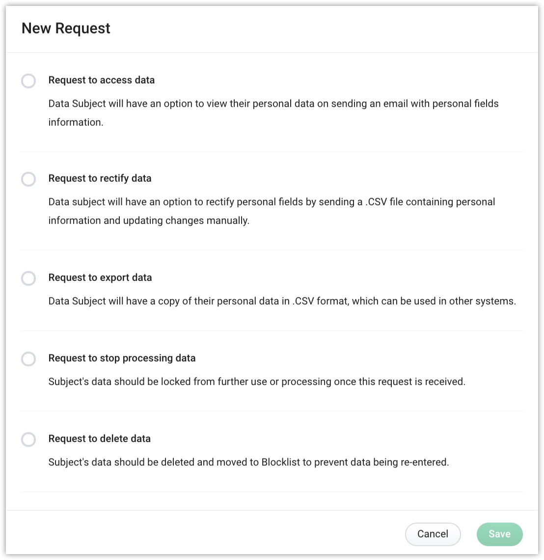 • Select from the list of Communication Preferences mentioned by the data subject.