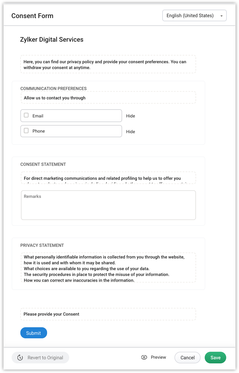 • For Consent Statement, add a message that asks the data subjects to provide remarks, if any.