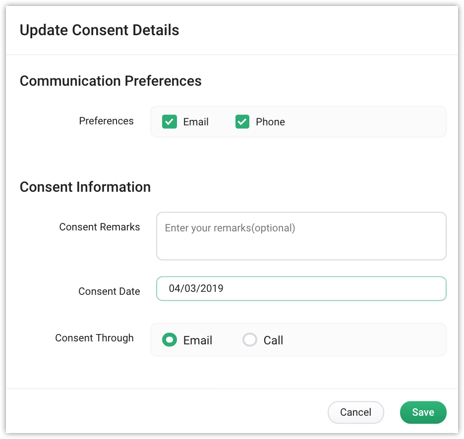 • Select Email or Call, to maintain a record of how you received the consent.