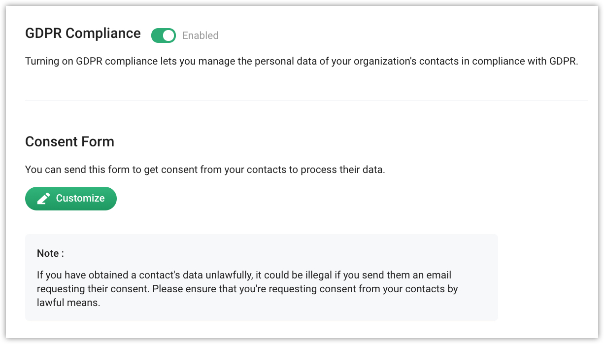 Under compliance settings, you need to first switch on GDPR compliance settings if it applies to your business.