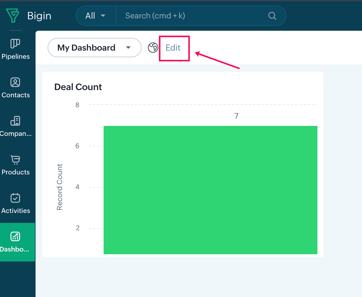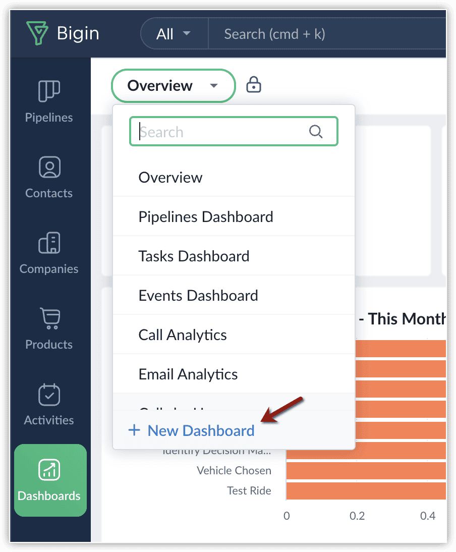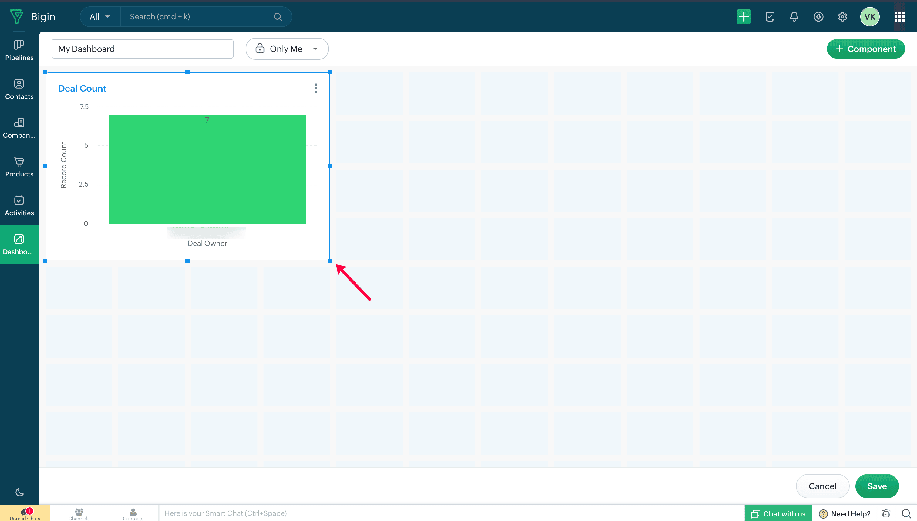 Grouping in Bigin dashboards refers to organizing your data based on a specific field, such as Stage, Owner, or Pipeline. This allows you to visualize how data is distributed across different values within that field. For example, the number of deals per stage.