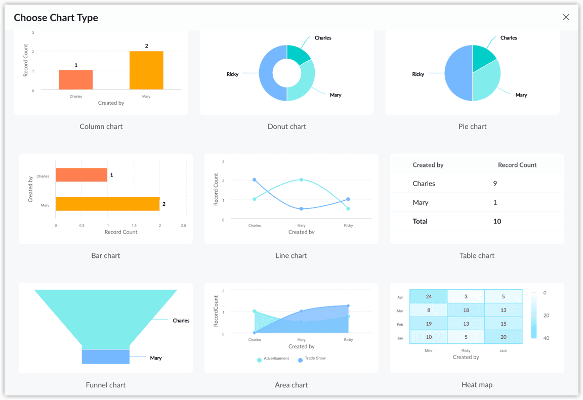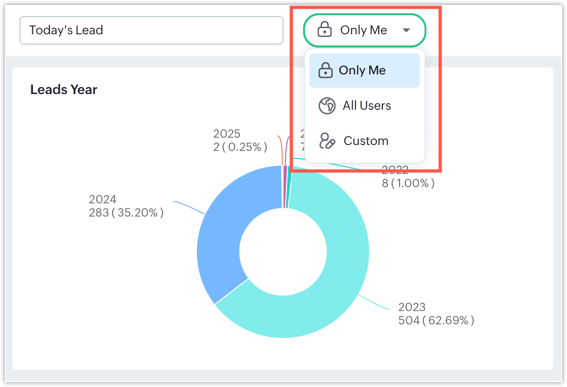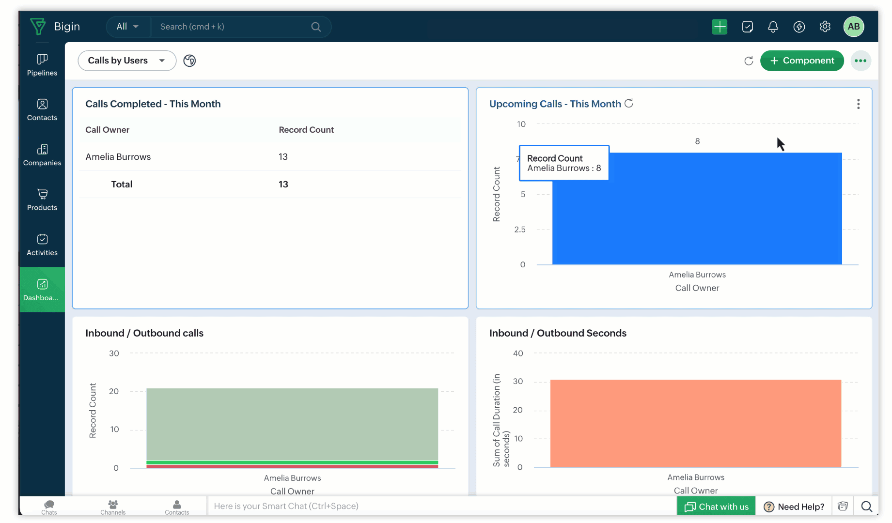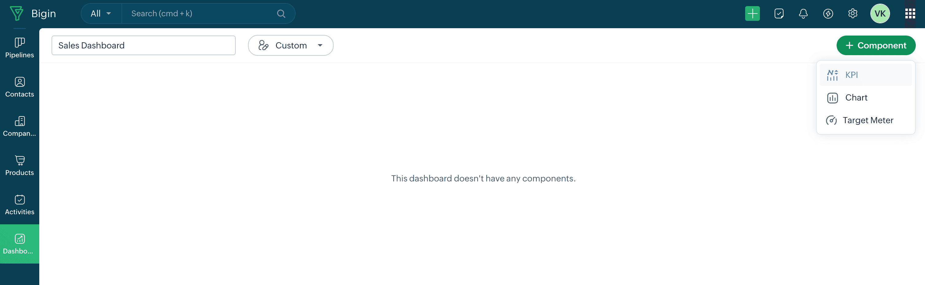 Grouping in Bigin dashboards refers to organizing your data based on a specific field, such as Stage, Owner, or Pipeline. This allows you to visualize how data is distributed across different values within that field. For example, the number of deals per stage.