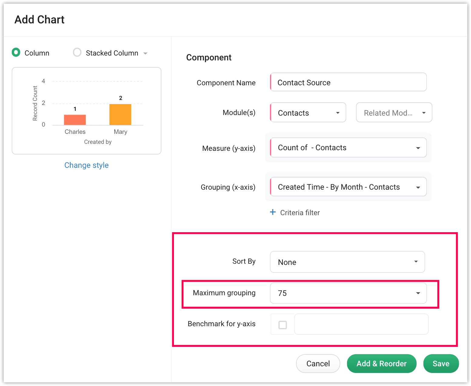 Bigin allows a maximum of 75 groups per dashboard component. This means when you group data by a particular field, only the first 75 unique values (groups) will be shown, or, based on sorting order, the first 75 unique values (groups) will be shown.