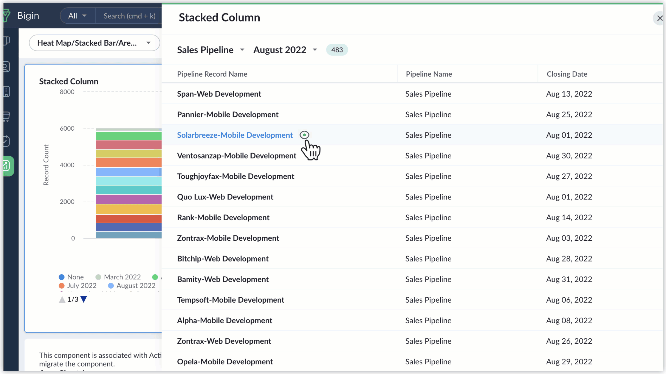 A popup window appears showing the list of records (e.g., deals, contacts, activities) that make up that data point.
