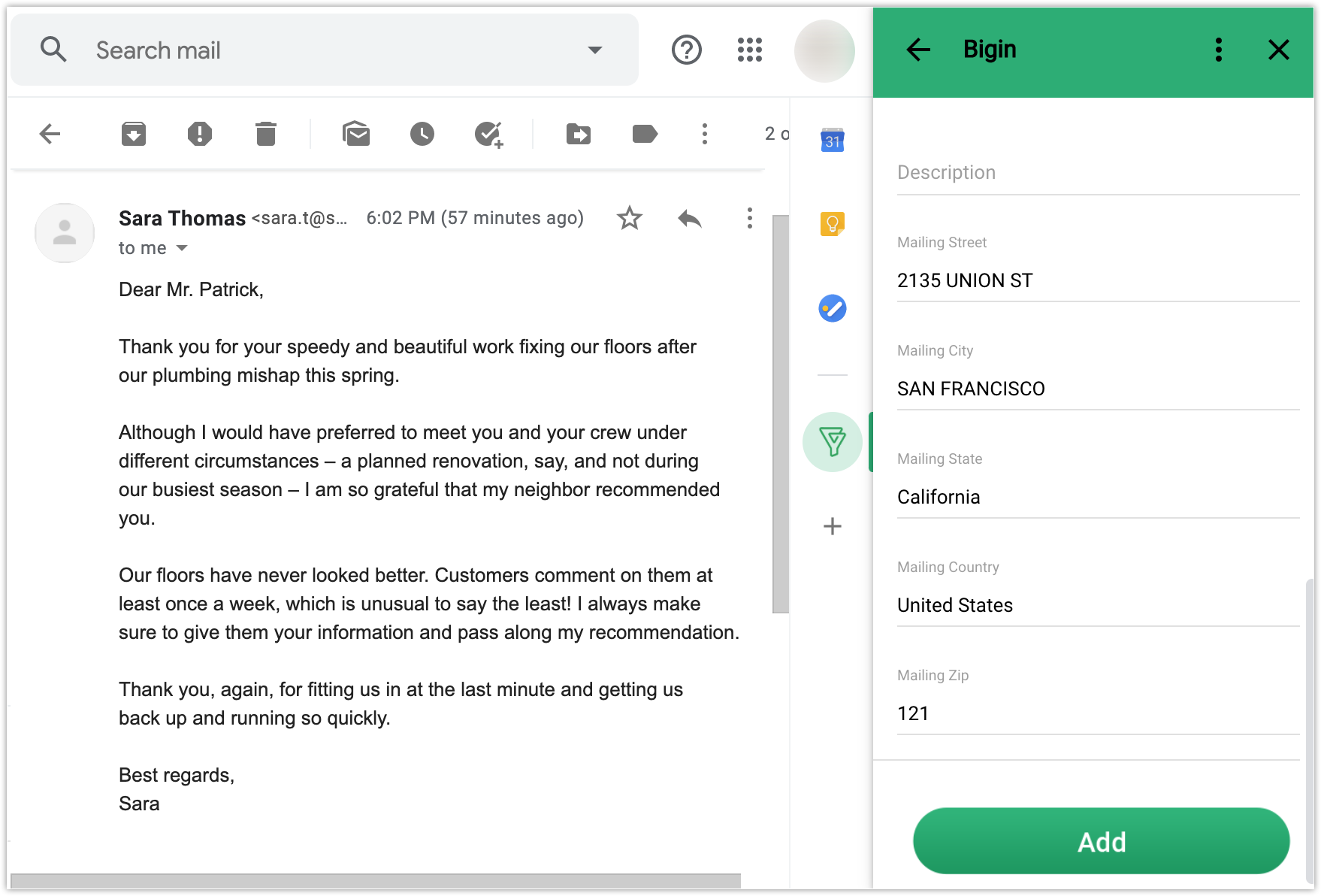 Add new contacts from your Gmail account When you receive emails from prospects who aren't in the Contacts module, you get an option to add them as contacts in your Bigin account.