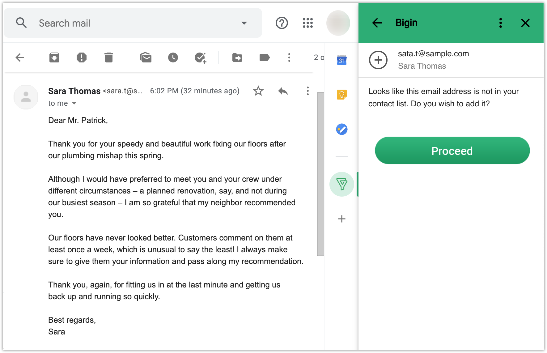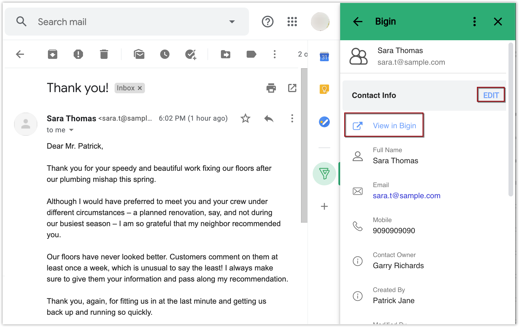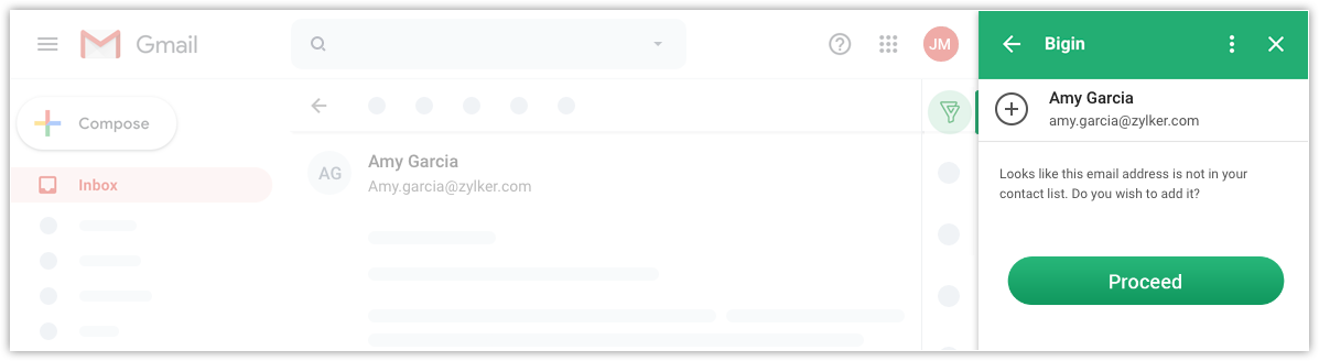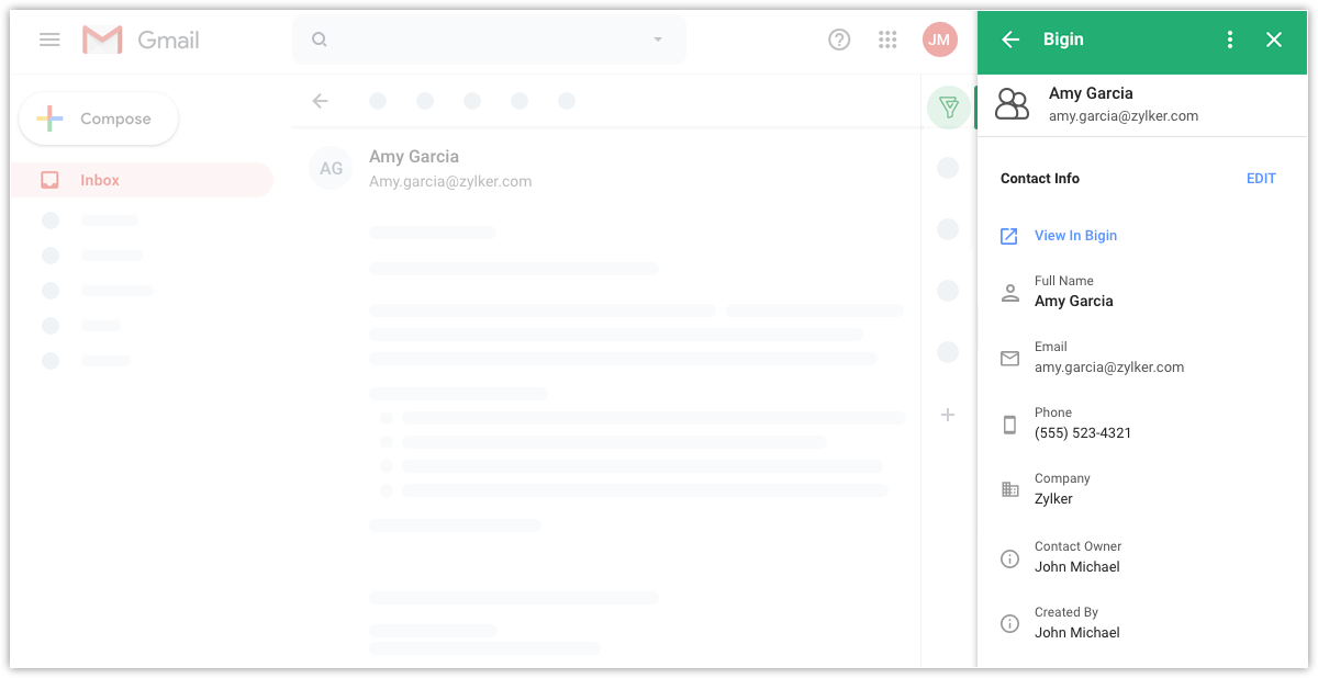 View the Contact information (customers) When you receive emails to your Gmail account, you can identify whether they are your existing contacts, by opening the email. The Bigin add-on will display contact's information from Bigin.