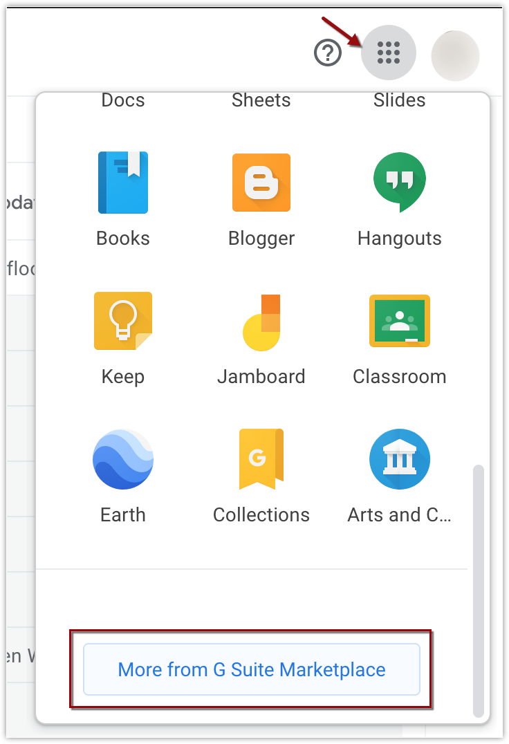 Click the Google Apps icon in your Gmail account and click More from G Suite Marketplace.