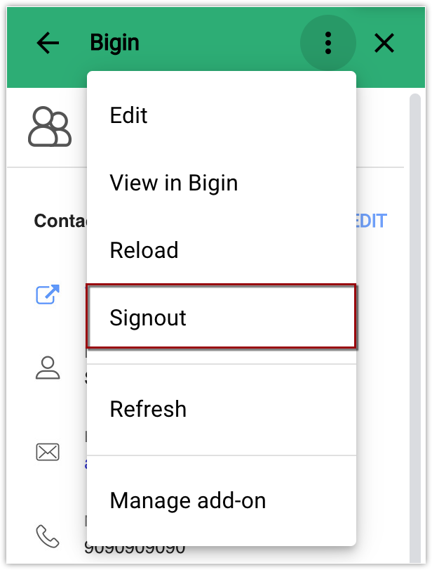 Signing out from the Bigin add-on will not allow you to view or add contacts from your Gmail account. You can sign in later to initiate the synchronization between the two platforms. To sign out, click More > Signout in the add-on.