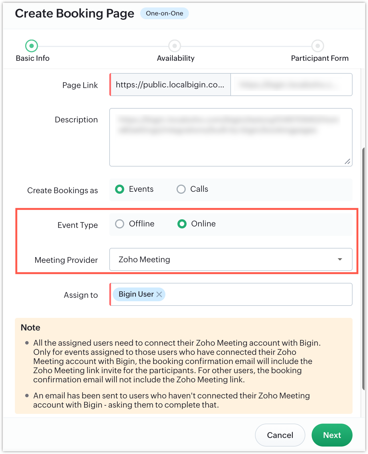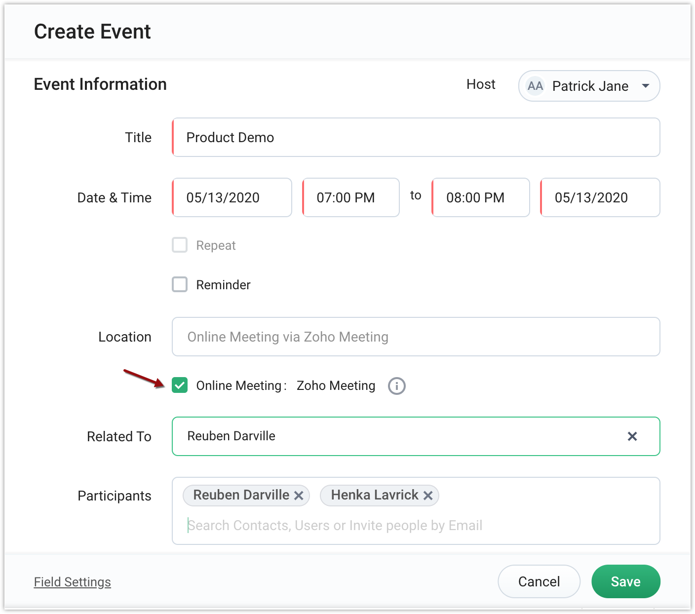 Integrating Bigin and Zoho Meeting, will give an option to convert an event into an online meeting and it will be automatically captured in Zoho Meeting.
