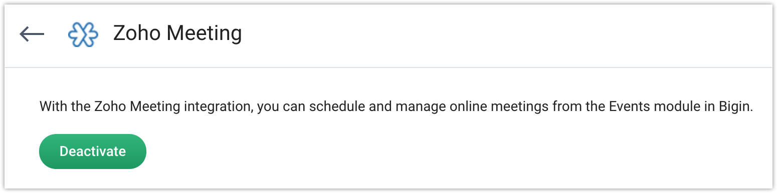 Disabling Zoho Meeting integration will no longer allow you to create an online meeting. However, the meetings that you had created earlier will not be deleted from Bigin and Zoho Meeting.